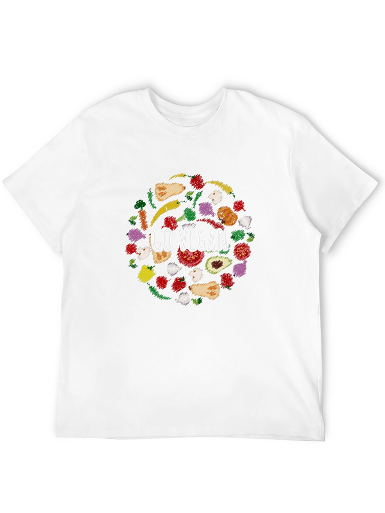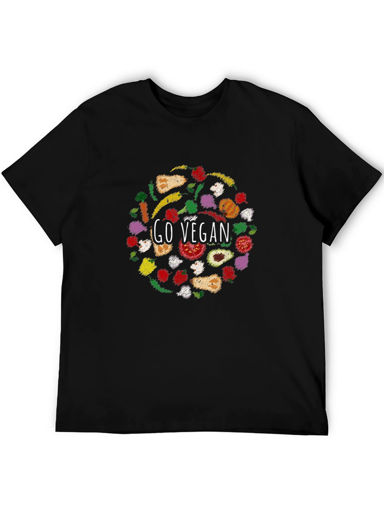 Embrace a plant-based lifestyle with this stylish black t-shirt. The shirt features a unique circular graphic filled with colorful vegetables such as tomatoes, carrots, onions, peppers, and avocados. In the middle of the design, the phrase "Go Vegan" is displayed. Made from comfortable material, this t-shirt is perfect for everyday wear, vegan events, or as a conversation starter. Express your passion for healthy eating and animal welfare with this eye-catching tee. Makes a great gift for vegan friends and family. Get yours today!
