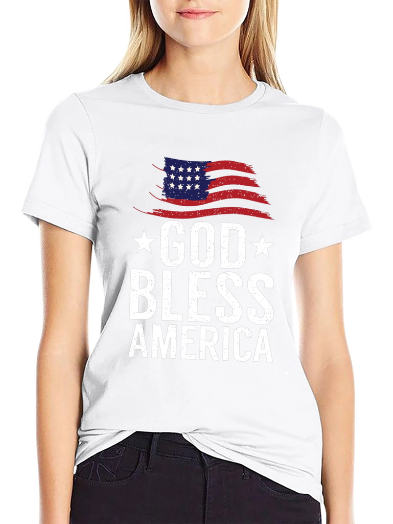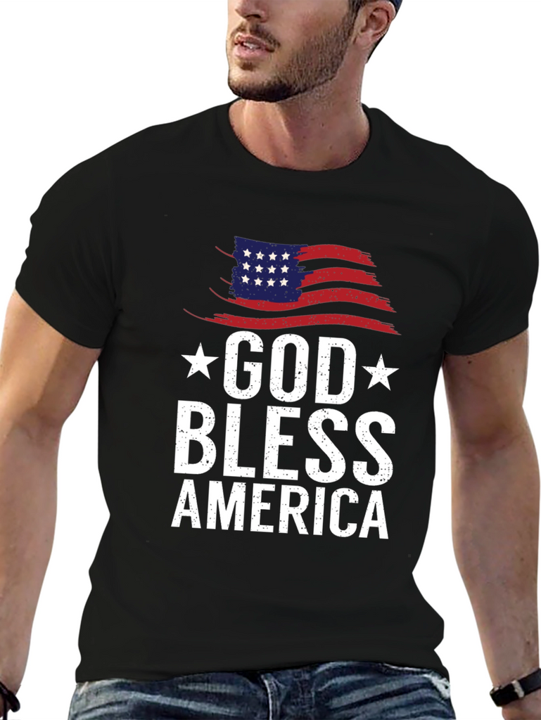 Show your American pride with this stylish black t-shirt! The design features a distressed American flag graphic, a bold "GOD BLESS AMERICA" print in white, and stars that add a patriotic touch. Made from a comfortable-looking fabric, this short-sleeved shirt is perfect for everyday wear. Ideal for celebrating national holidays, showing your support for the USA, or simply expressing your love for your country. A great addition to any casual wardrobe.