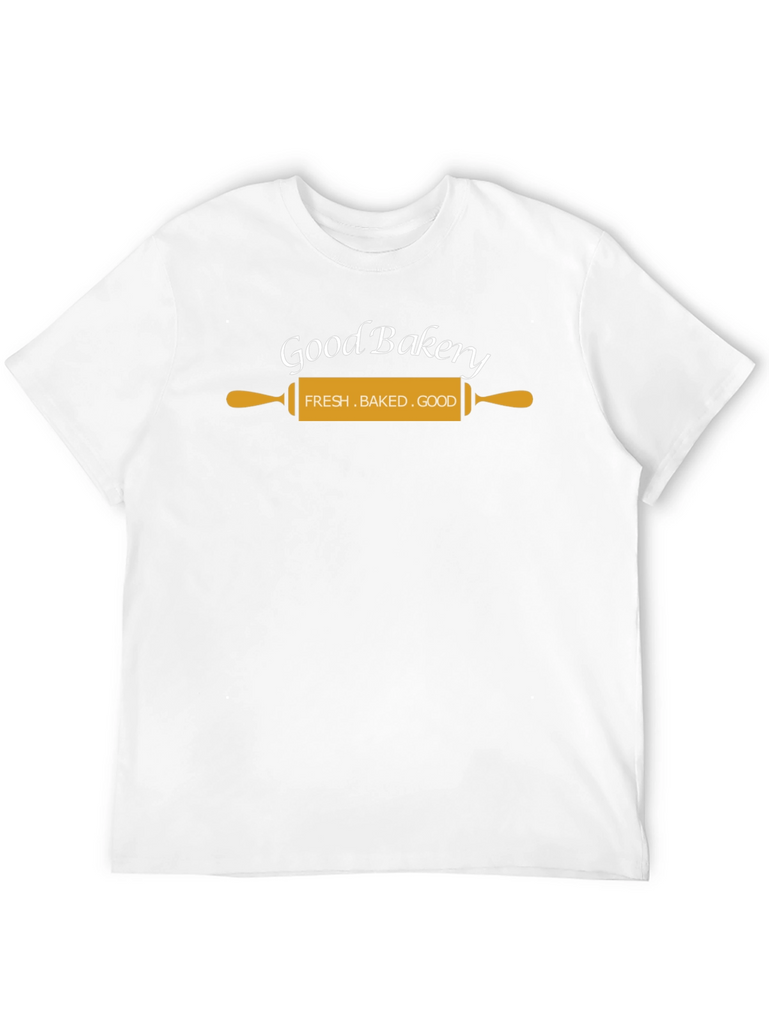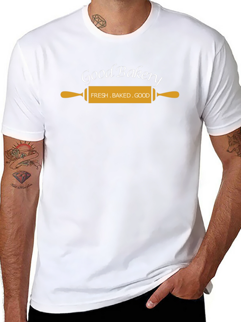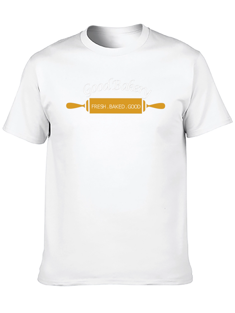Show off your love for baking with this Good Bakery T-shirt! This classic crew neck tee features a stylish design with 'Good Bakery' text accompanied by a rolling pin graphic with 'FRESH . BAKED . GOOD' text. Made from comfortable, breathable fabric, this shirt is perfect for everyday wear or as a gift for the baking enthusiast in your life. Wear it while baking your favorite recipe or out and about, sharing your passion for all things bakery. This stylish T-shirt will quickly become a favorite in your wardrobe. Grab yours today!