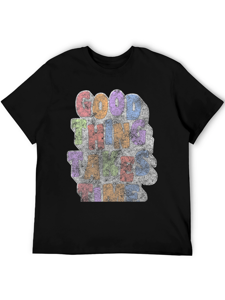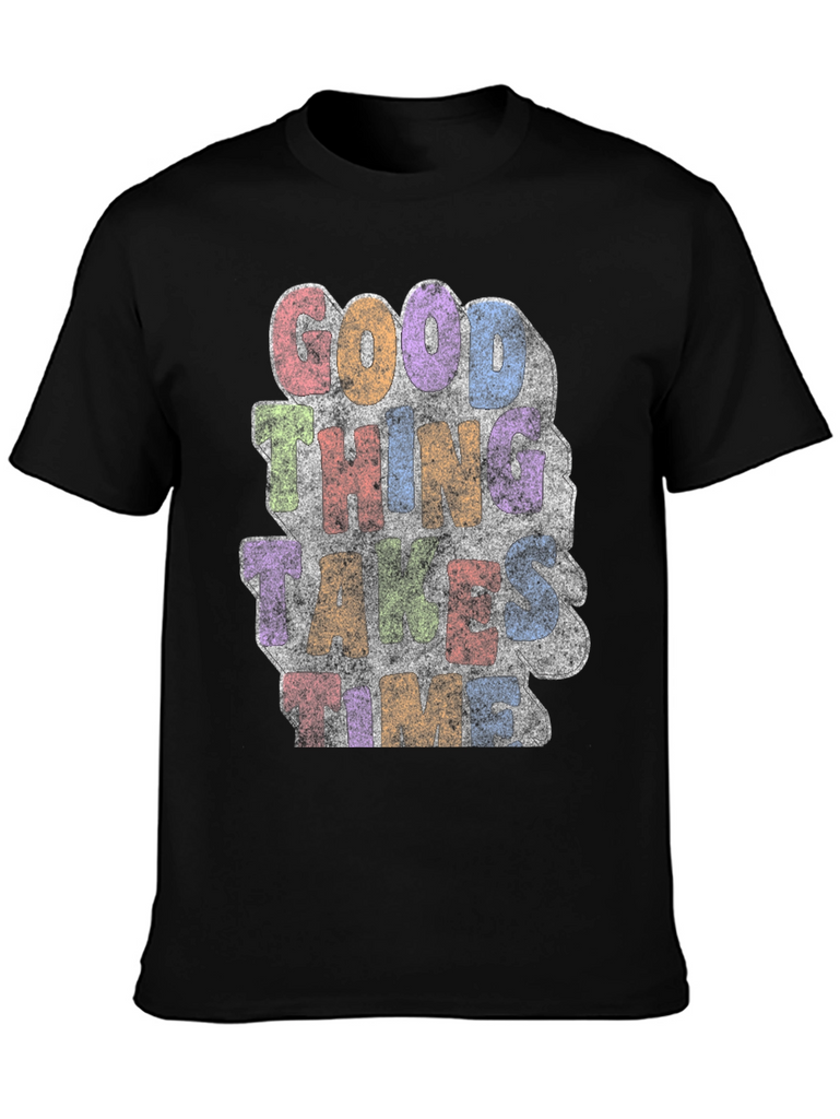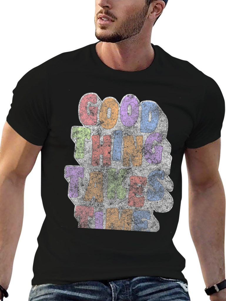 Embrace patience with this stylish black t-shirt featuring a vibrant, distressed print that reads 'Good Things Take Time.' The retro-inspired design incorporates a mix of pastel colors, adding a touch of vintage charm. Made from a soft, breathable fabric, this tee offers both comfort and style. Perfect for casual wear, this t-shirt is a great reminder to stay positive and appreciate the process. Showcase your laid-back attitude while making a statement with this unique and eye-catching graphic tee.
