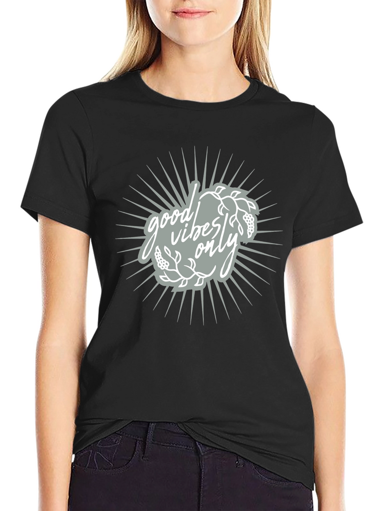 Elevate your casual style with this unique black graphic tee. Featuring a bold "Good Vibes Only" design surrounded by radiating sunbursts and botanical accents, this shirt is perfect for spreading positivity and making a statement. The design is printed in light gray, contrasting nicely with the black t-shirt. Crafted from comfortable material, this tee offers a relaxed fit and feel, making it ideal for everyday wear. Pair it with jeans, shorts, or your favorite bottoms for a cool, laid-back look that reflects your optimistic attitude. This tee is a must-have for anyone who values comfort, style, and good vibes.