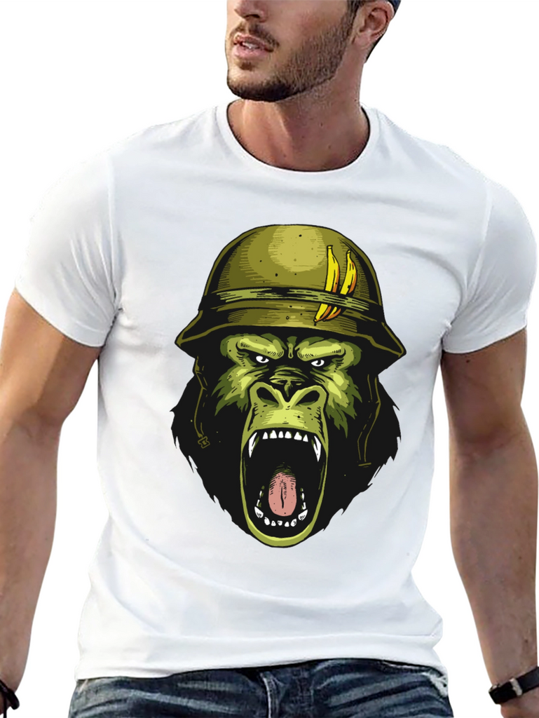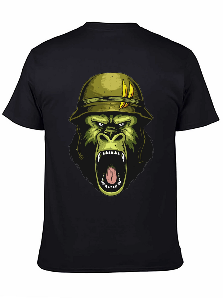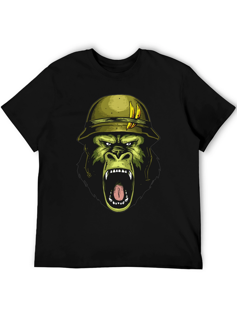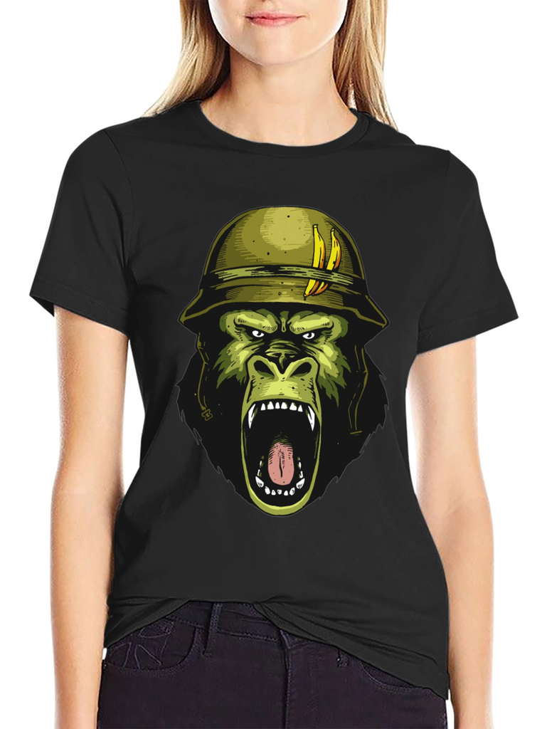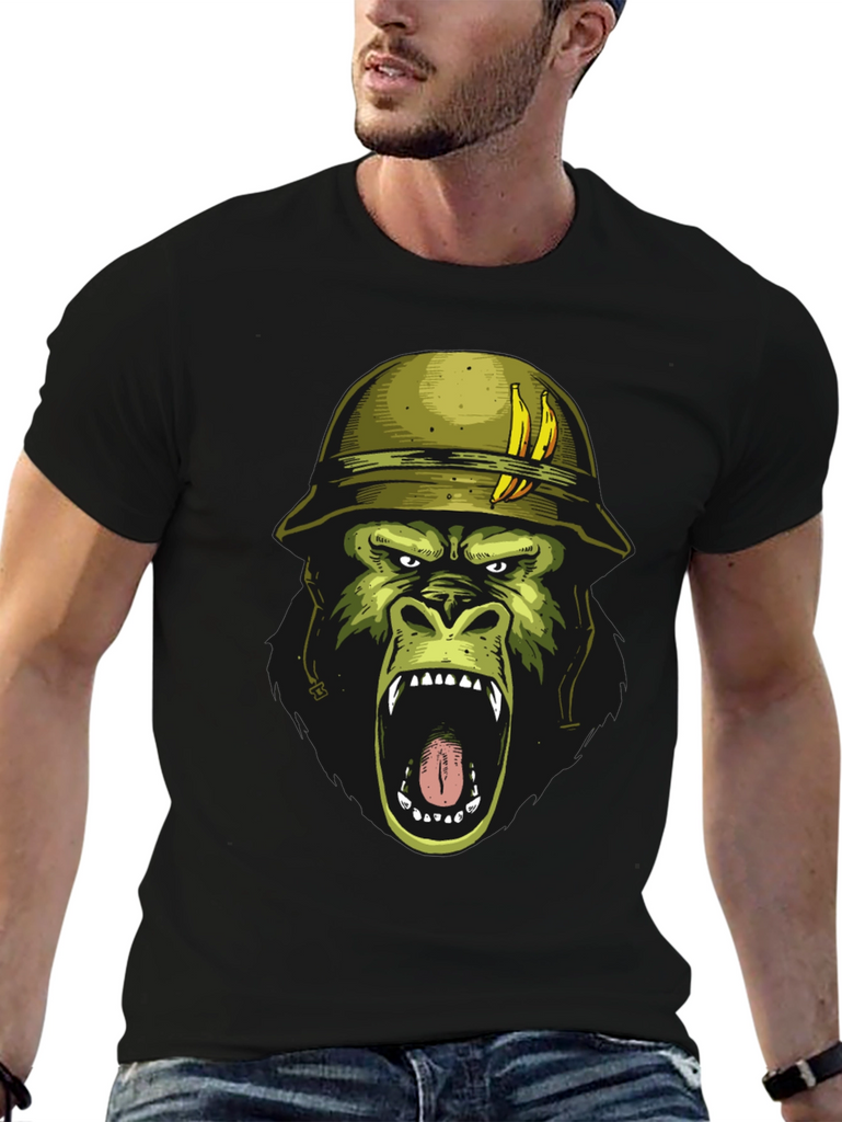 This striking black t-shirt features a unique graphic design of a fierce gorilla wearing a military helmet. The vibrant colors and detailed artwork make a bold statement. Crafted from a comfortable-looking fabric, this tee offers both style and ease. Perfect for casual wear, concerts, or adding an edgy touch to your everyday look. Show off your individuality with this eye-catching gorilla soldier tee.