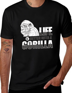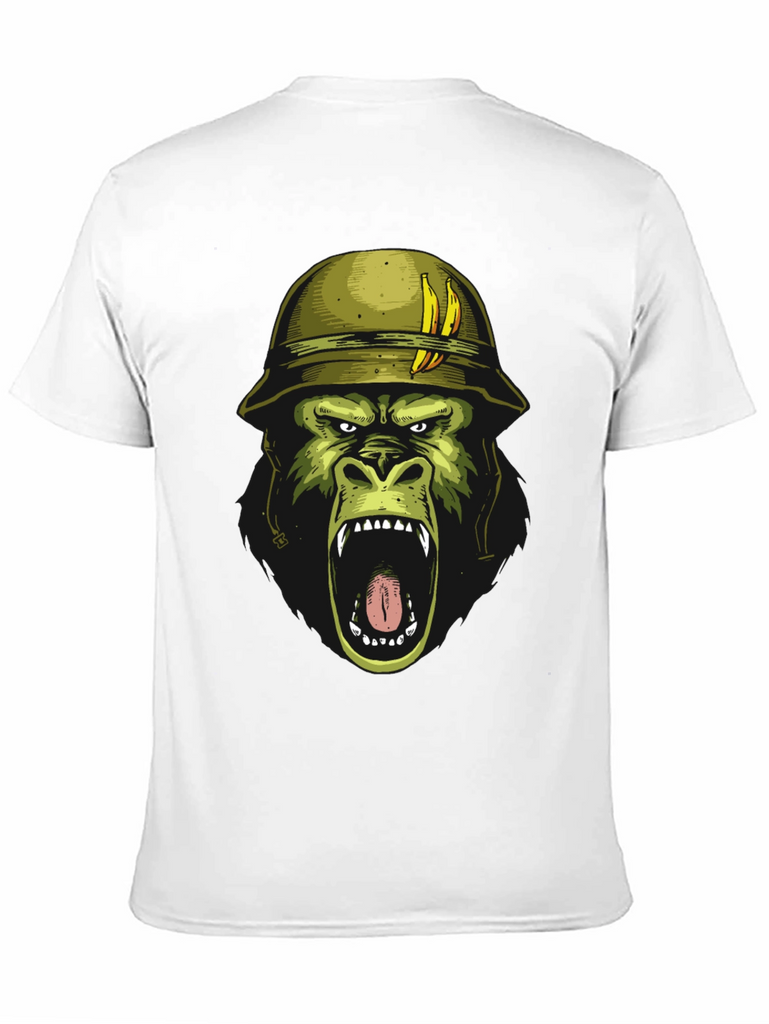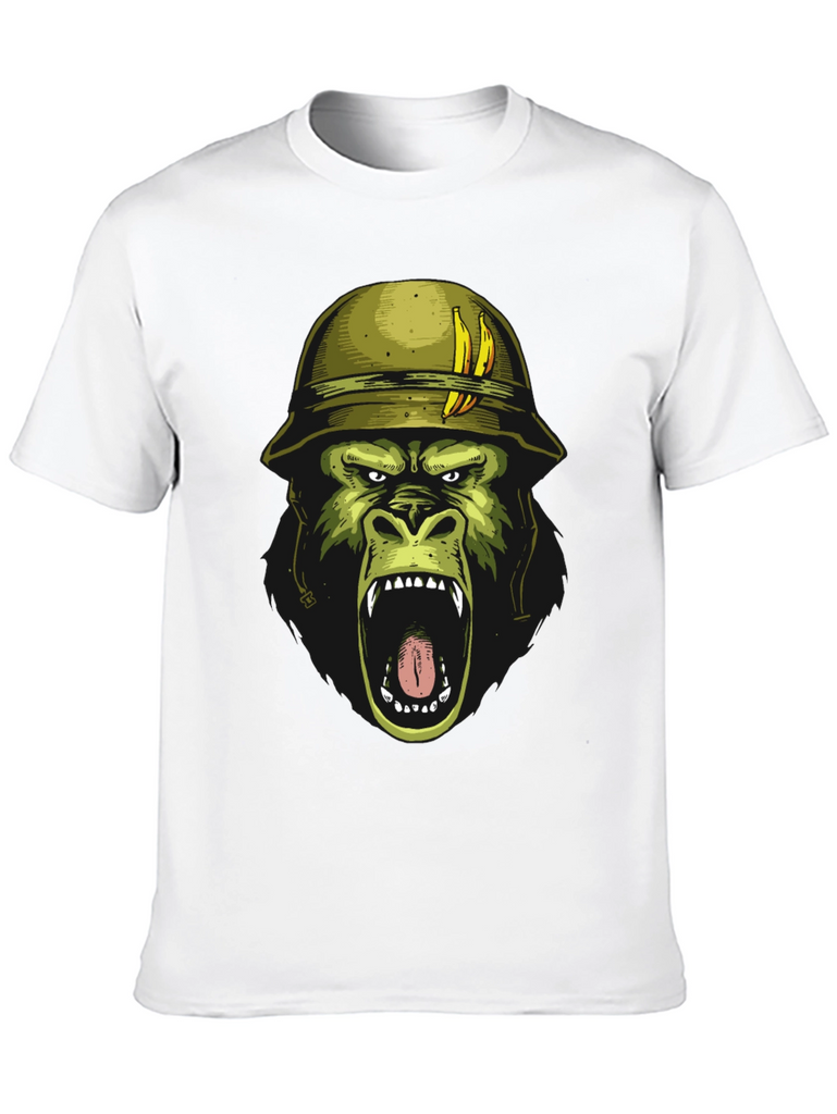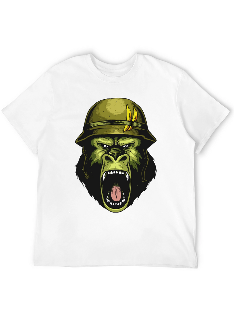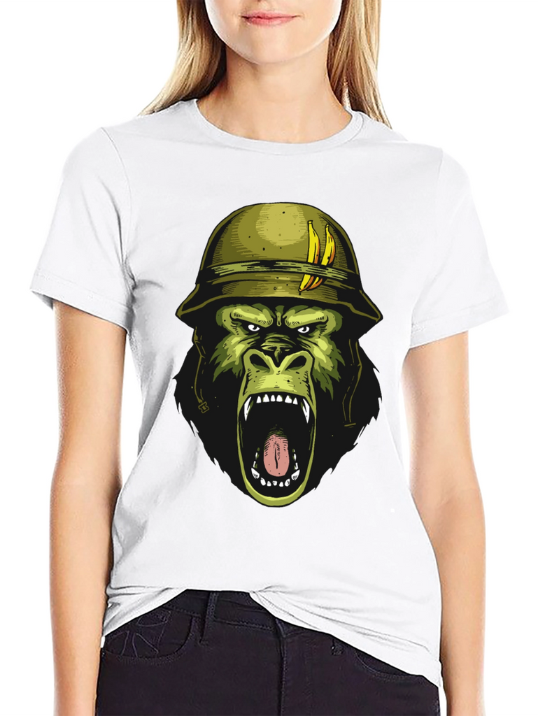 This striking black t-shirt features a unique graphic design of a fierce gorilla wearing a military helmet. The vibrant colors and detailed artwork make a bold statement. Crafted from a comfortable-looking fabric, this tee offers both style and ease. Perfect for casual wear, concerts, or adding an edgy touch to your everyday look. Show off your individuality with this eye-catching gorilla soldier tee.