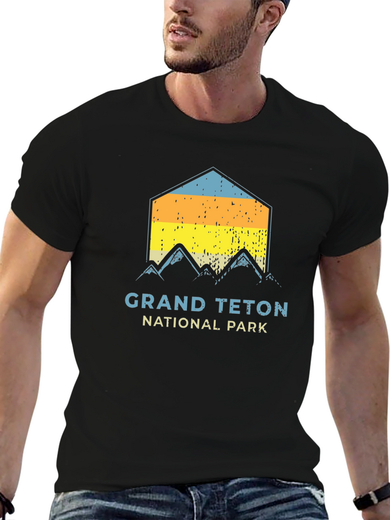 Show your love for the great outdoors with this stylish black graphic tee. Featuring a unique vintage-inspired design of the Grand Teton mountain range at sunset, this t-shirt is perfect for nature lovers and adventure seekers. The shirt is made from a comfortable and durable fabric, suitable for everyday wear. The design includes 'GRAND TETON NATIONAL PARK' text, making it a great conversation starter. Perfect for casual outings, hiking trips, or simply relaxing at home. Grab yours today and showcase your passion for one of America's most beautiful national parks!