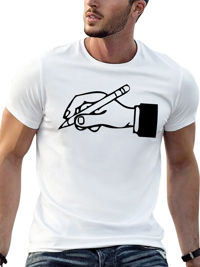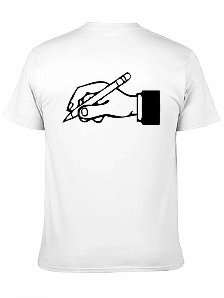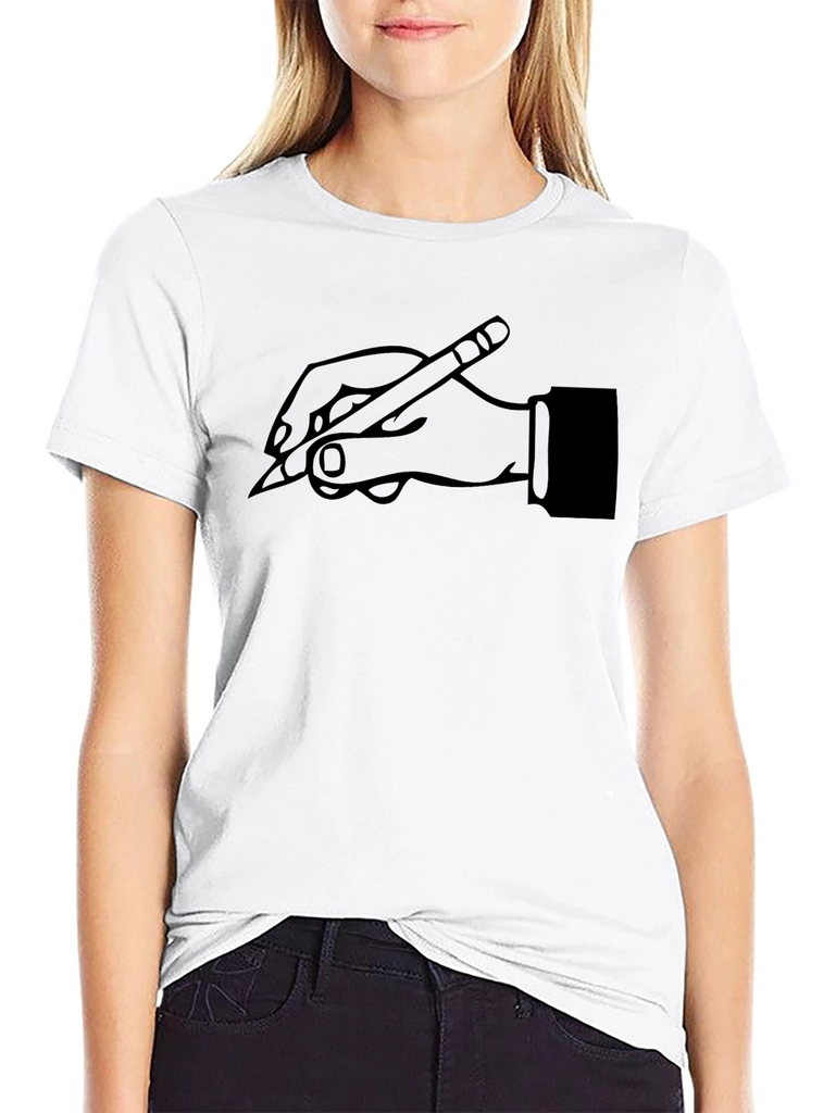 This stylish black t-shirt features a unique graphic print of a hand holding a pencil. The design is bold and eye-catching, making it a great conversation starter. Made from a comfortable, breathable fabric, this tee is perfect for everyday wear. Whether you're an artist, writer, or just appreciate a cool design, this t-shirt is a great addition to your wardrobe. Pair it with jeans, shorts, or a skirt for a casual and trendy look. Show off your creative side with this awesome graphic tee!