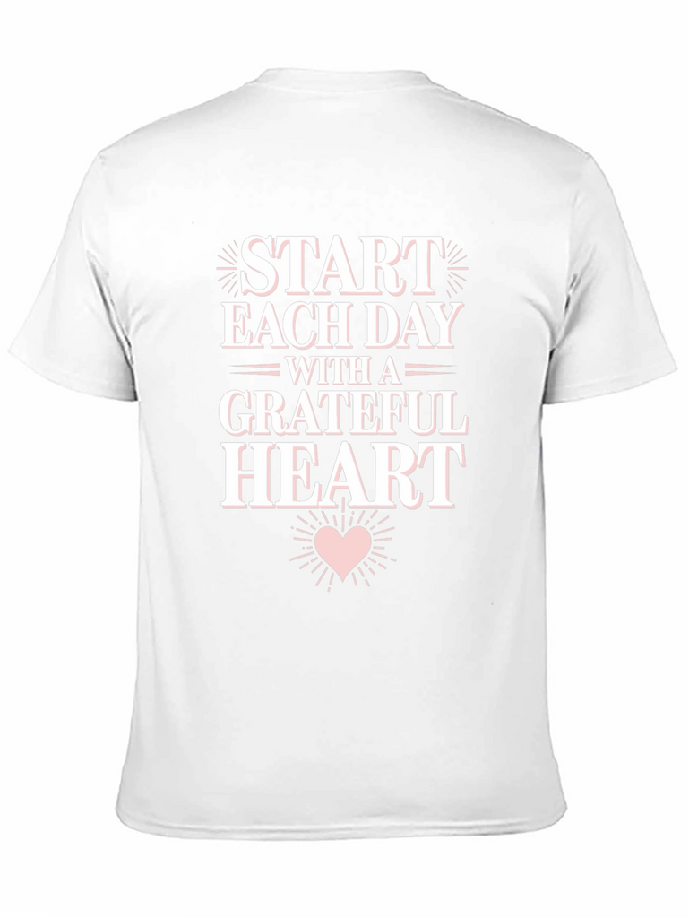 This black graphic tee features the inspiring message "START EACH DAY WITH A GRATEFUL HEART." The design is printed in an appealing pinkish-white font, with a cute heart image adding a touch of charm. Made from comfortable fabric, this t-shirt offers a relaxed fit perfect for everyday wear. Show off your positive outlook with this motivational tee, ideal for casual outings, workouts, or simply lounging at home. A great addition to any wardrobe, it's perfect for anyone who wants to spread good vibes.