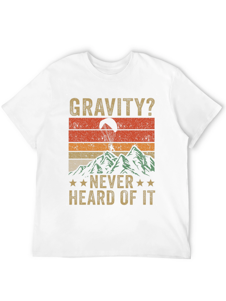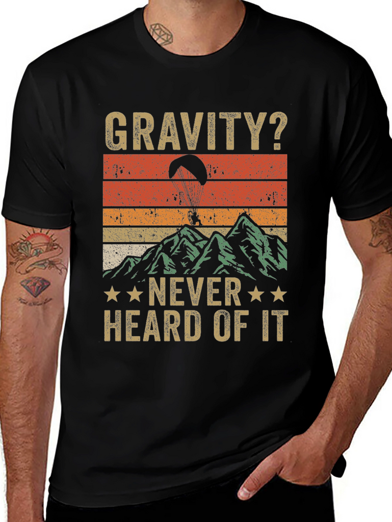 Show off your adventurous spirit with this unique paragliding t-shirt! Featuring a vintage-inspired design, this black tee showcases a vibrant sunset backdrop over a mountainous landscape, complete with a paraglider soaring through the air. The playful slogan "Gravity? Never Heard of It" adds a touch of humor and perfectly captures the thrill of the sport. Made from a comfortable fabric, this t-shirt is ideal for casual wear, outdoor activities, or as a fun gift for paragliding enthusiasts. Get ready to defy gravity in style!