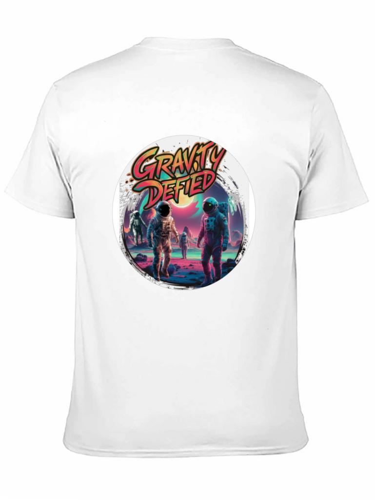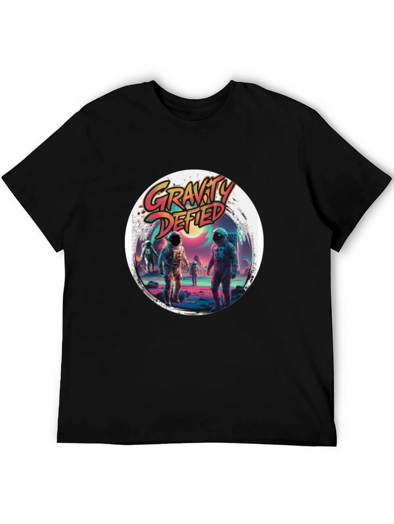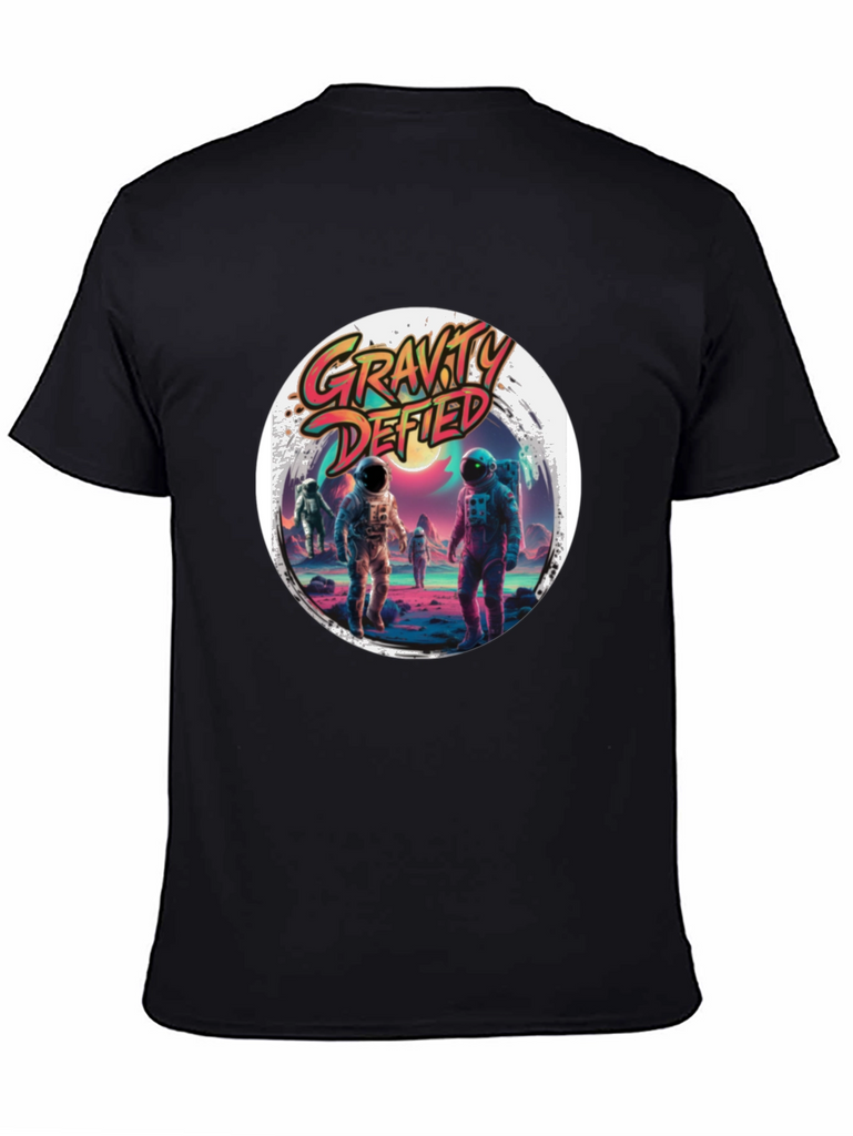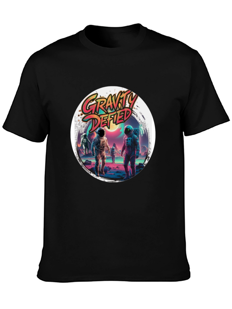 Explore the unknown in style with this unique black T-shirt. Featuring a captivating "Gravity Defied" graphic, this tee showcases astronauts on an otherworldly landscape, blending retro vibes with modern design. The circular print is eye-catching, making it a great statement piece. Crafted from soft, breathable fabric, this shirt offers both comfort and style. Perfect for casual outings, space enthusiasts, or anyone looking to add a touch of cosmic flair to their wardrobe. Pair it with jeans or shorts for an effortlessly cool look. Get ready to defy gravity and turn heads wherever you go!