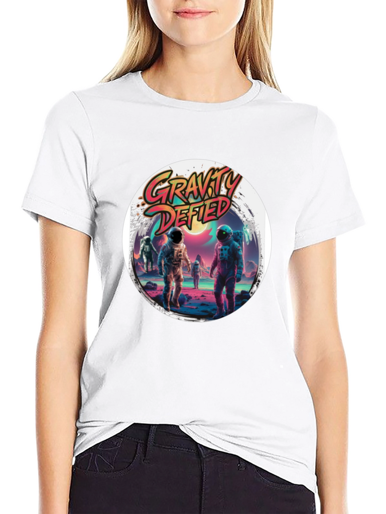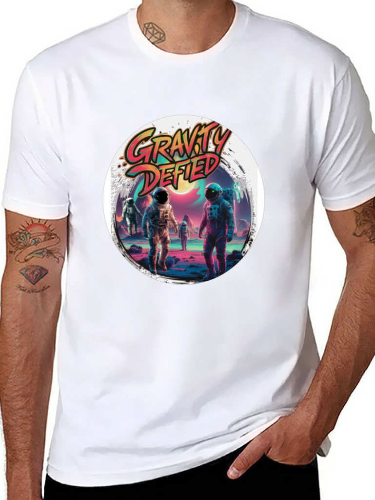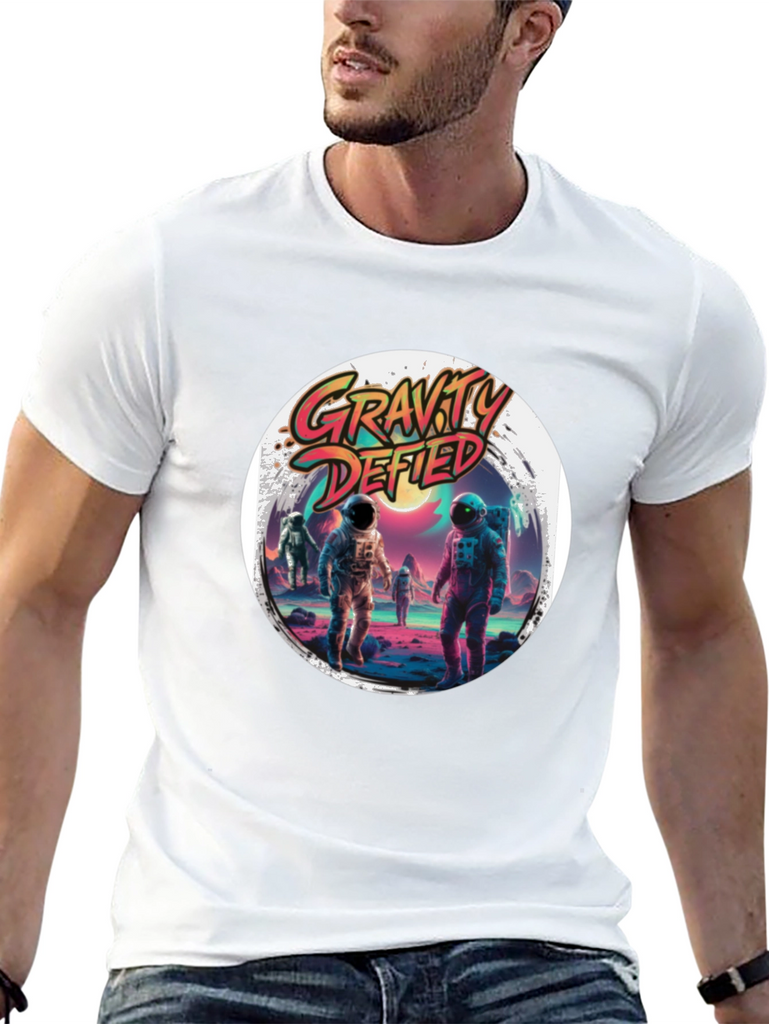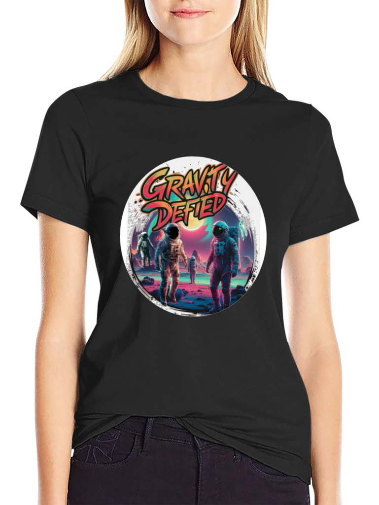 Explore the unknown in style with this unique black T-shirt. Featuring a captivating "Gravity Defied" graphic, this tee showcases astronauts on an otherworldly landscape, blending retro vibes with modern design. The circular print is eye-catching, making it a great statement piece. Crafted from soft, breathable fabric, this shirt offers both comfort and style. Perfect for casual outings, space enthusiasts, or anyone looking to add a touch of cosmic flair to their wardrobe. Pair it with jeans or shorts for an effortlessly cool look. Get ready to defy gravity and turn heads wherever you go!