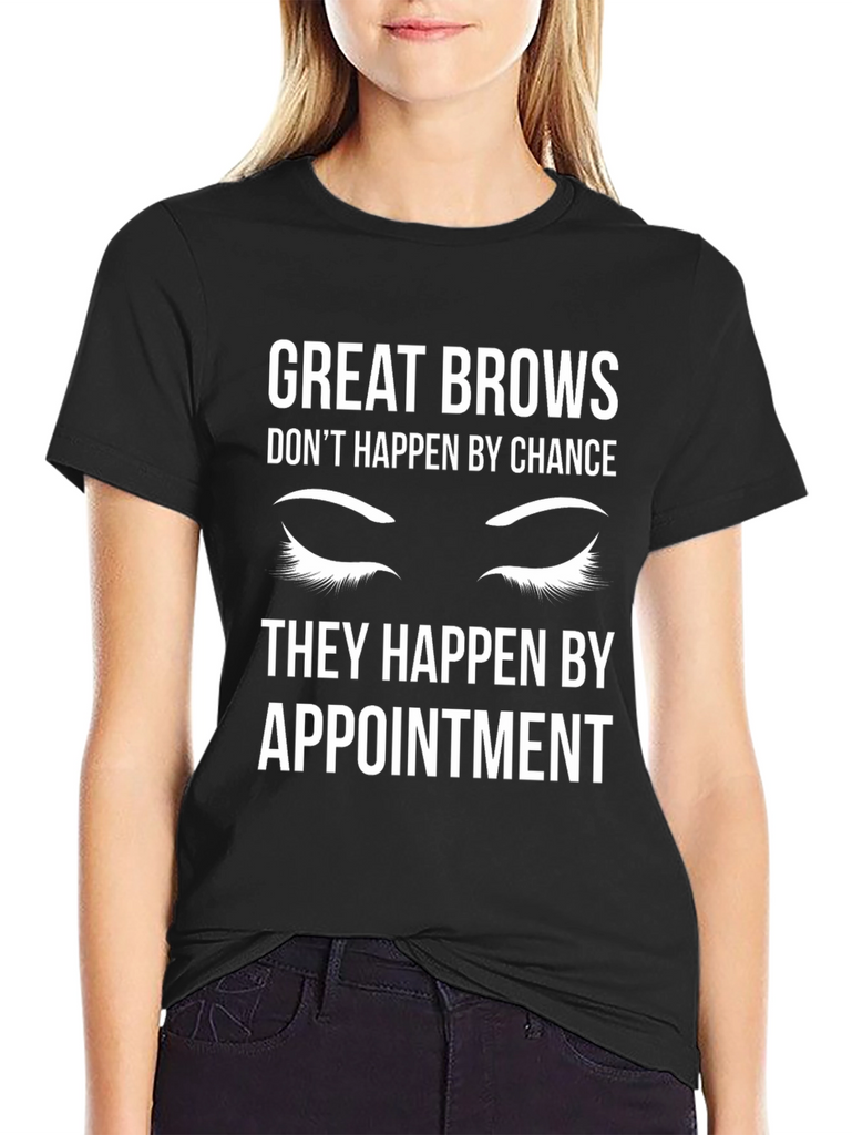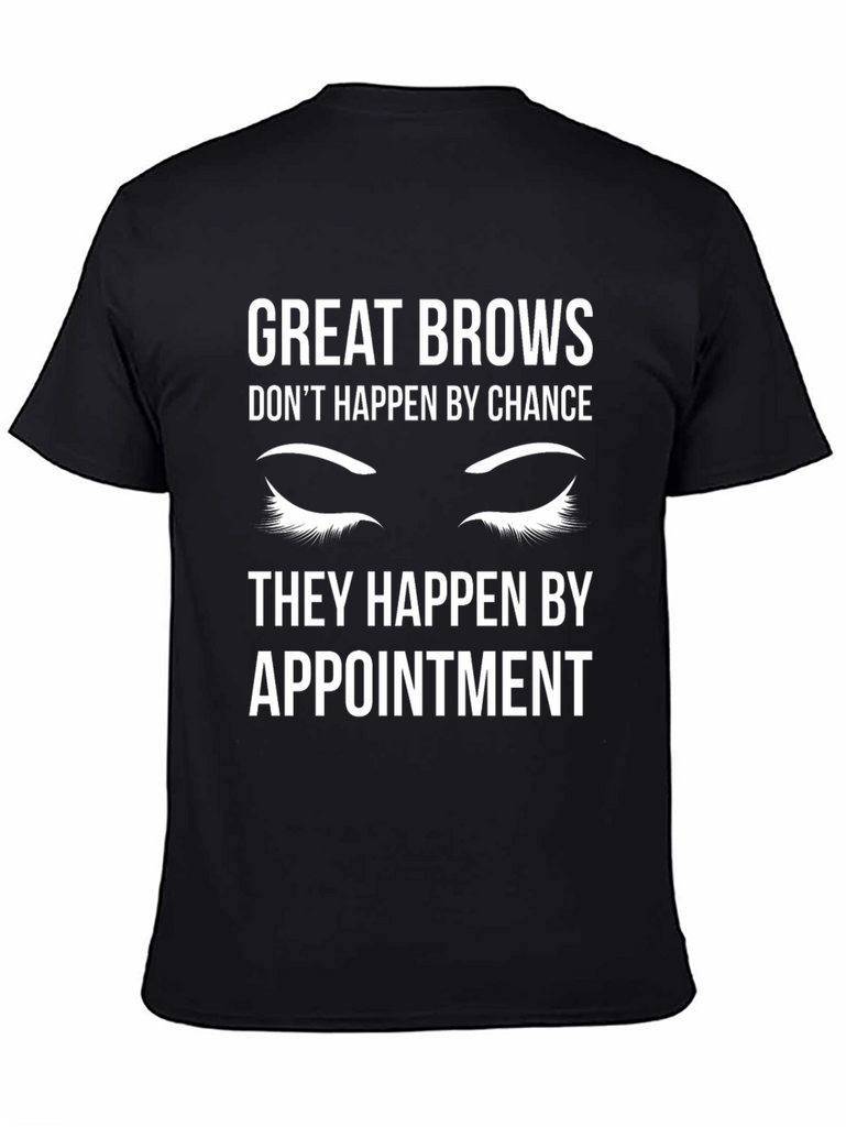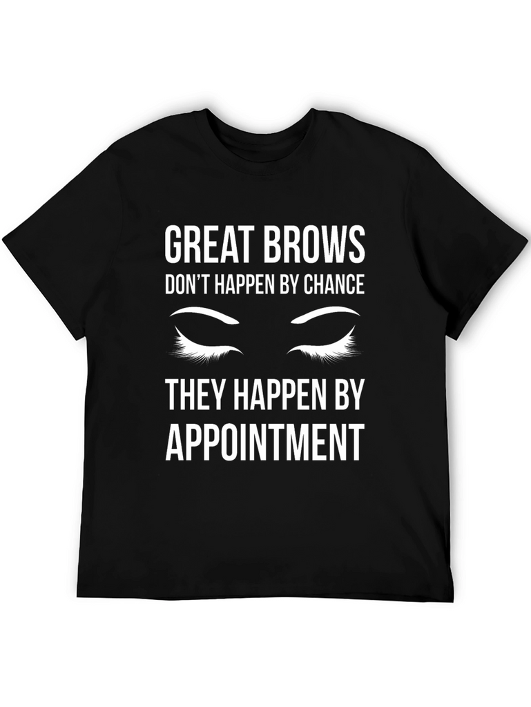 This stylish black t-shirt features a fun and fashionable design for those who appreciate perfectly groomed eyebrows. The text "GREAT BROWS DON'T HAPPEN BY CHANCE, THEY HAPPEN BY APPOINTMENT" is prominently displayed in white, accompanied by stylized eye graphics with luscious lashes. The classic fit and soft fabric make it comfortable for everyday wear. Show off your passion for beauty and make a statement with this eye-catching t-shirt, perfect for wearing to a salon or beauty appointment, or as a casual and expressive everyday piece. It's also a great gift for your favorite esthetician or brow artist! Grab yours today!