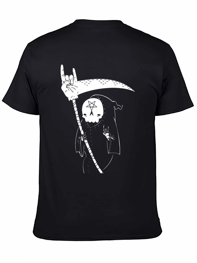 Show your love for metal and the macabre with this cool black t-shirt. It features a unique graphic of the Grim Reaper rocking out with a scythe in one hand and devil horns in the other. The design is a stark white contrast on the black background, making the image really stand out. Made with comfortable materials, this tee is perfect for concerts, casual outings, or lounging at home. If you love gothic, rock or metal styles, this shirt is for you! A must have for any fan of dark humor, metal music, or unique graphic tees.
