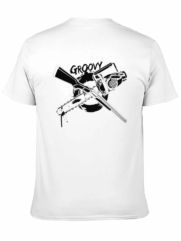 Show off your love for horror classics with this black graphic tee. The shirt features a chainsaw and rifle design, along with the word "Groovy". Made from comfortable material, it's perfect for everyday wear. This t-shirt is ideal for casual outings, movie nights, or as a gift for horror enthusiasts. A stylish statement piece that combines comfort and fandom.