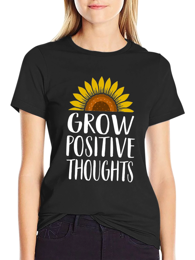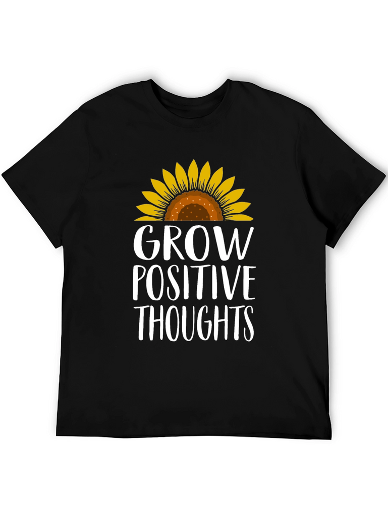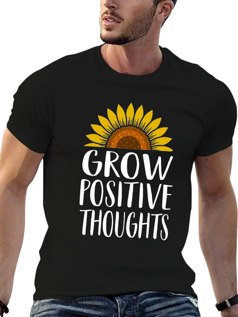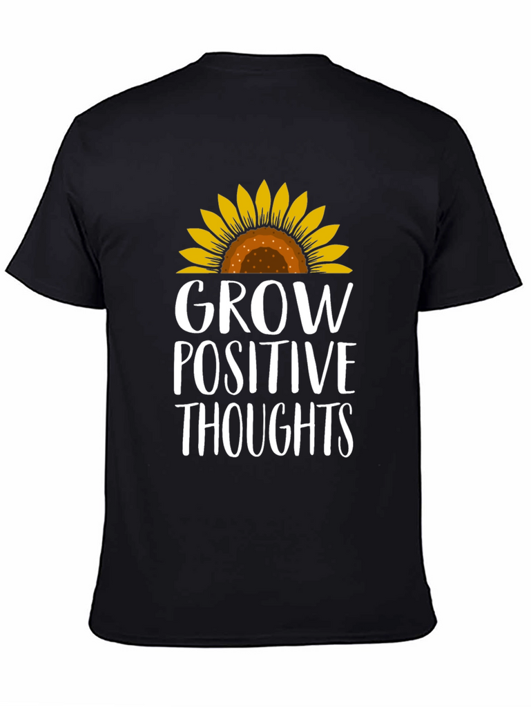 Radiate positivity with this charming black t-shirt! Featuring a vibrant sunflower graphic atop the empowering message "Grow Positive Thoughts", this tee combines style with inspiration. The design is printed in a crisp white font that stands out against the dark background. This comfortable tee is perfect for everyday wear, whether you're running errands, meeting friends, or simply lounging at home. Embrace good vibes and spread a little sunshine wherever you go with this stylish and uplifting t-shirt. A must-have for those who believe in the power of positive thinking and love to express their individuality through fashion!