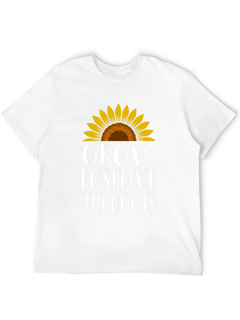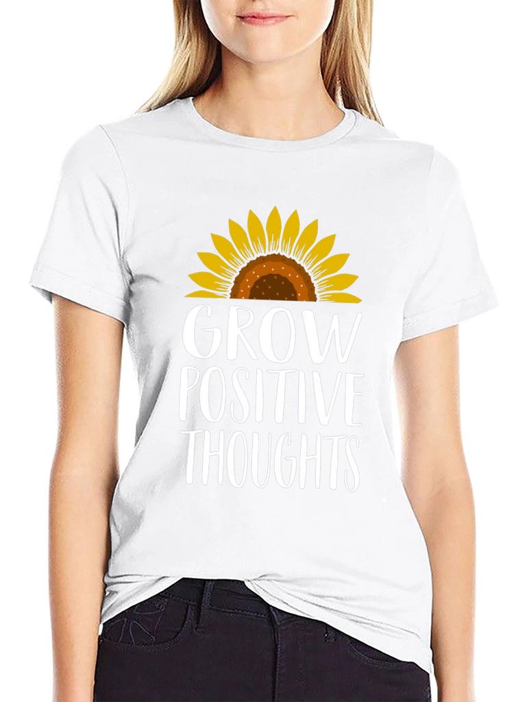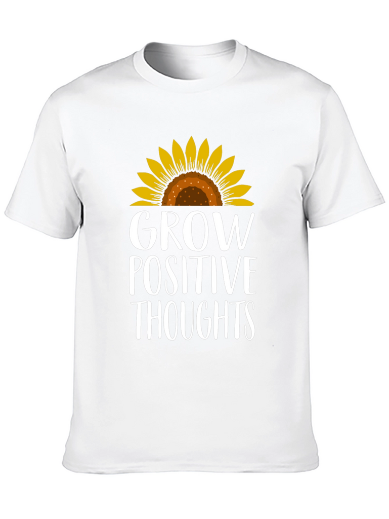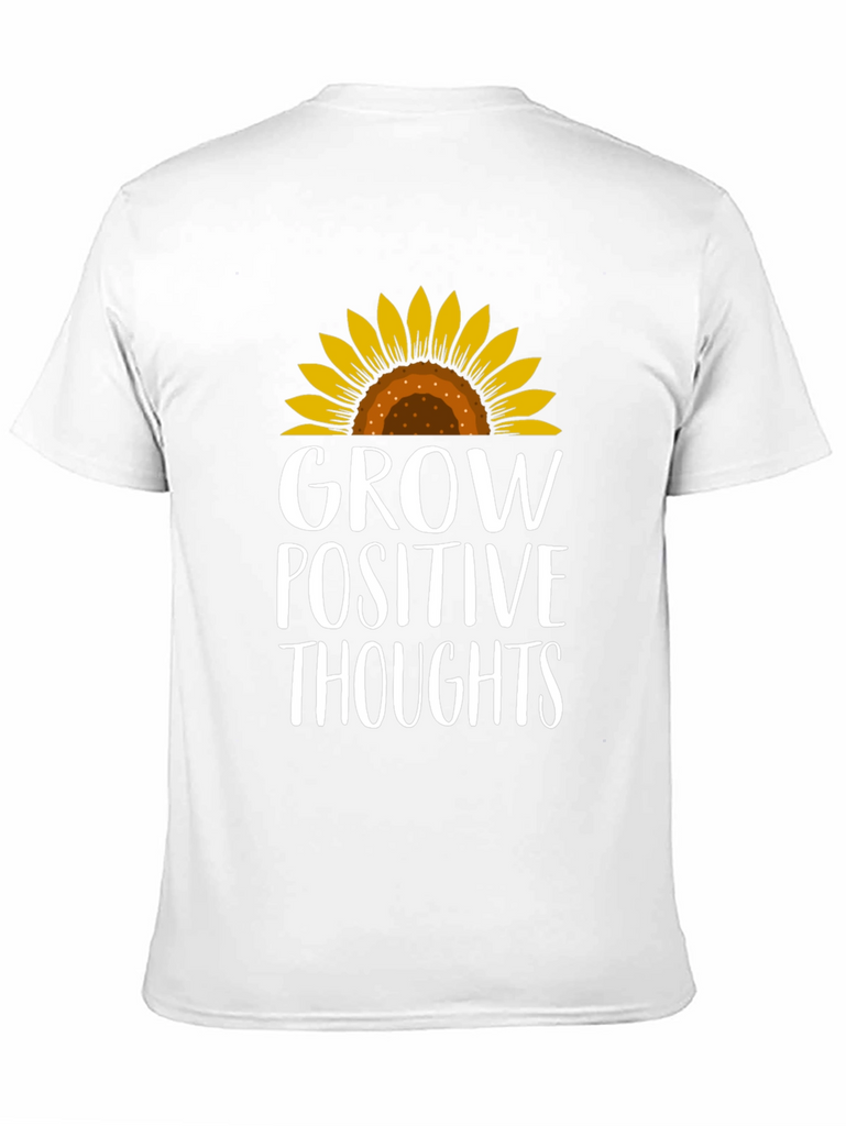 Radiate positivity with this charming black t-shirt! Featuring a vibrant sunflower graphic atop the empowering message "Grow Positive Thoughts", this tee combines style with inspiration. The design is printed in a crisp white font that stands out against the dark background. This comfortable tee is perfect for everyday wear, whether you're running errands, meeting friends, or simply lounging at home. Embrace good vibes and spread a little sunshine wherever you go with this stylish and uplifting t-shirt. A must-have for those who believe in the power of positive thinking and love to express their individuality through fashion!