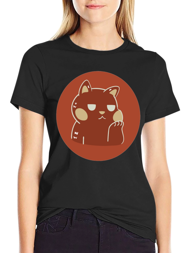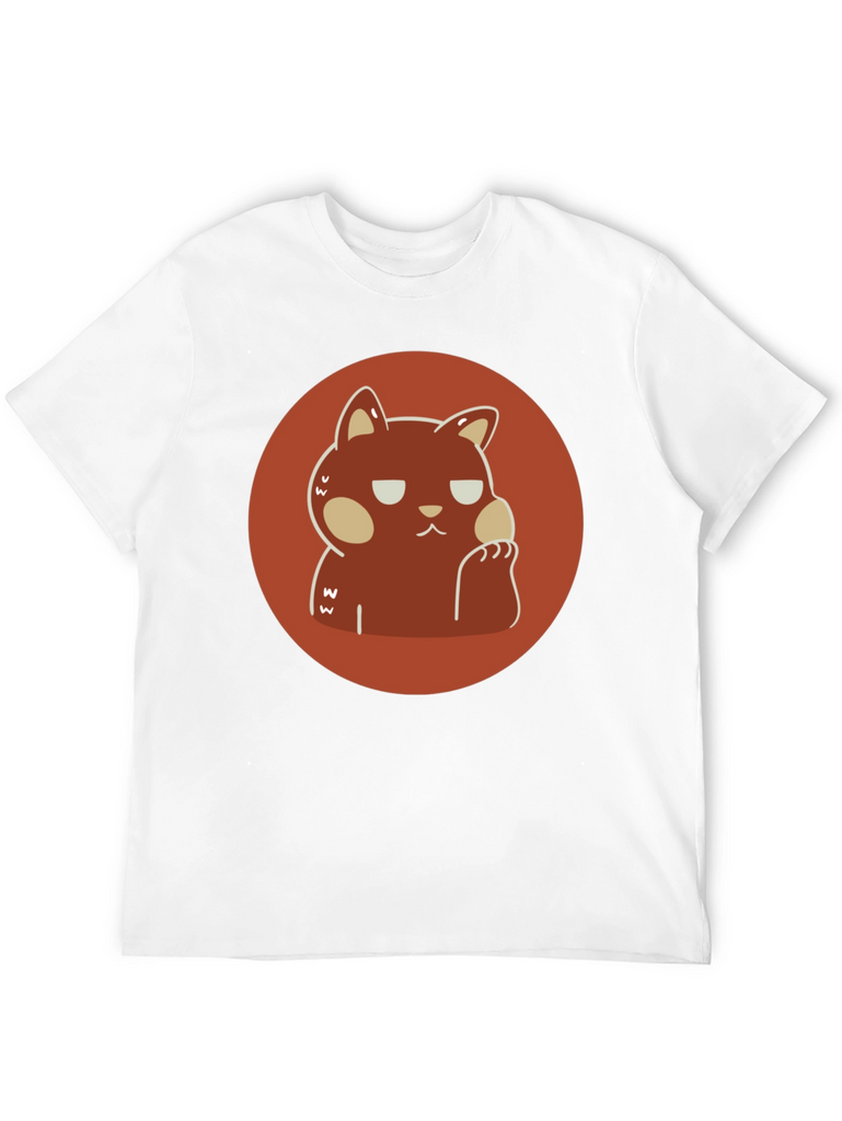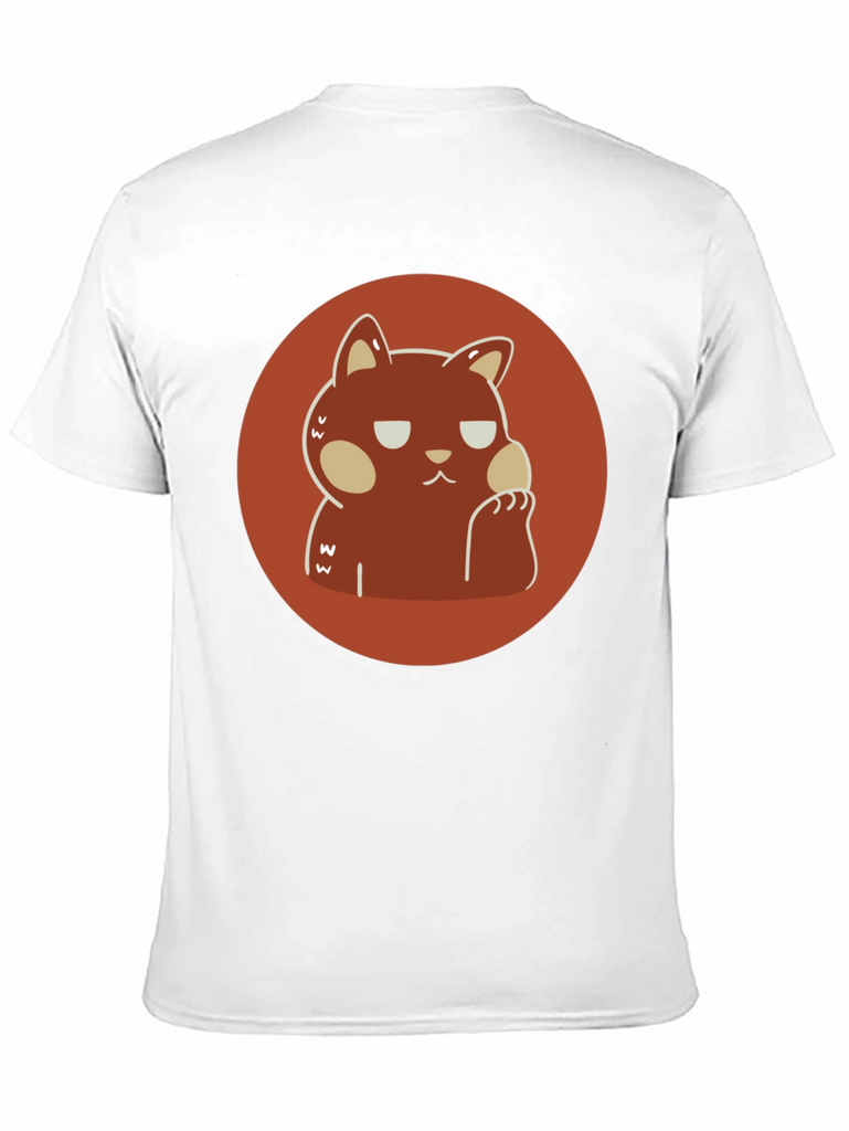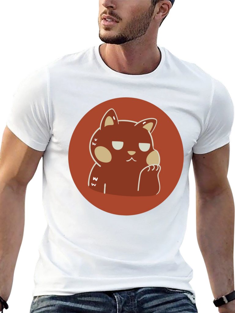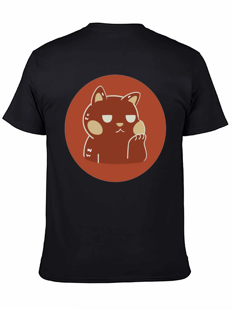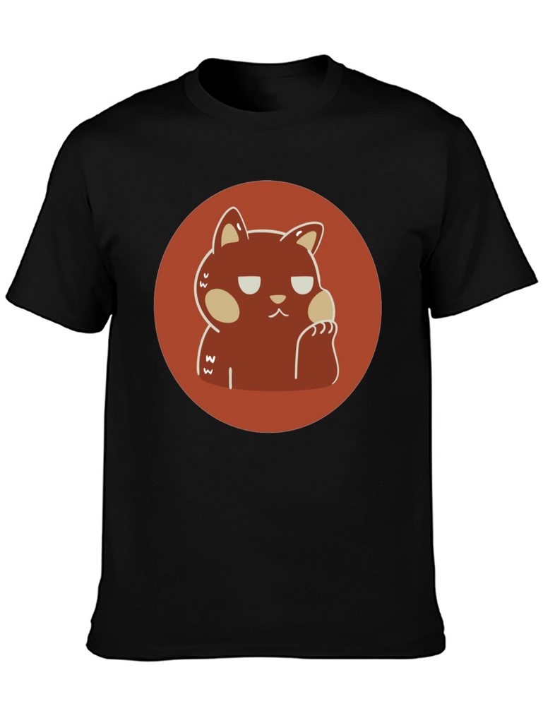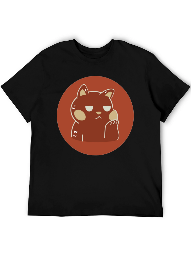 Show off your unique sense of style with this eye-catching men's graphic tee. The shirt features a cartoon illustration of a grumpy brown cat, set against a reddish-brown circle, making it a playful yet stylish choice for casual wear. Crafted from a soft, breathable fabric, this tee ensures all-day comfort. The dark color makes it versatile and easy to pair with jeans, shorts, or chinos. Whether you're lounging at home, hanging out with friends, or running errands, this t-shirt adds a touch of personality to any outfit. A must-have for cat lovers and anyone who enjoys fun, expressive fashion.