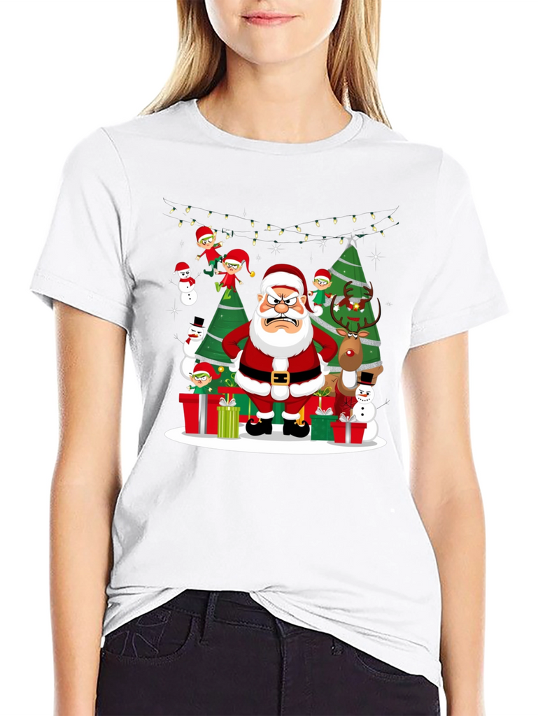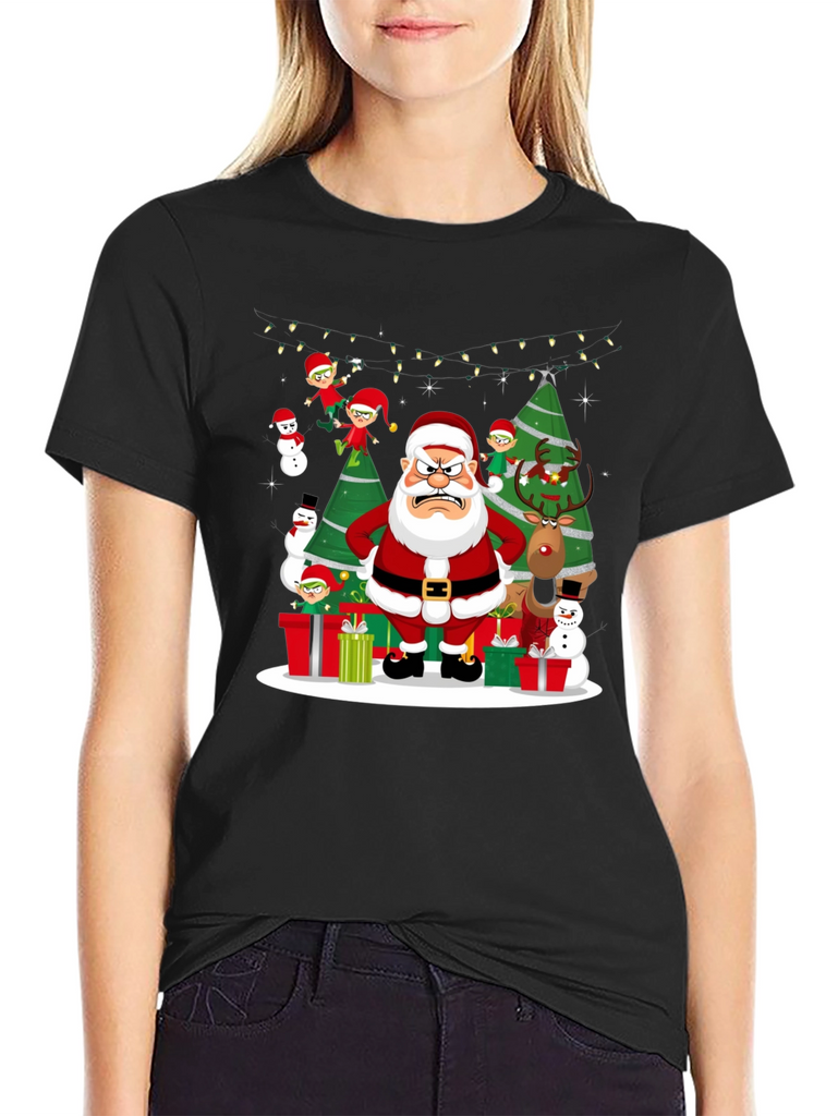 Spread some holiday cheer with this playful black t-shirt. The tee showcases an angry cartoon Santa surrounded by mischievous elves, gifts, snowmen, and a reindeer, all set against a backdrop of decorated Christmas trees and twinkling lights. It's a fun and quirky way to express your festive spirit, perfect for holiday parties, casual gatherings, or just adding a touch of whimsy to your everyday wardrobe. The comfortable fit and vibrant design make it a standout piece. Wear your holiday mood with pride!