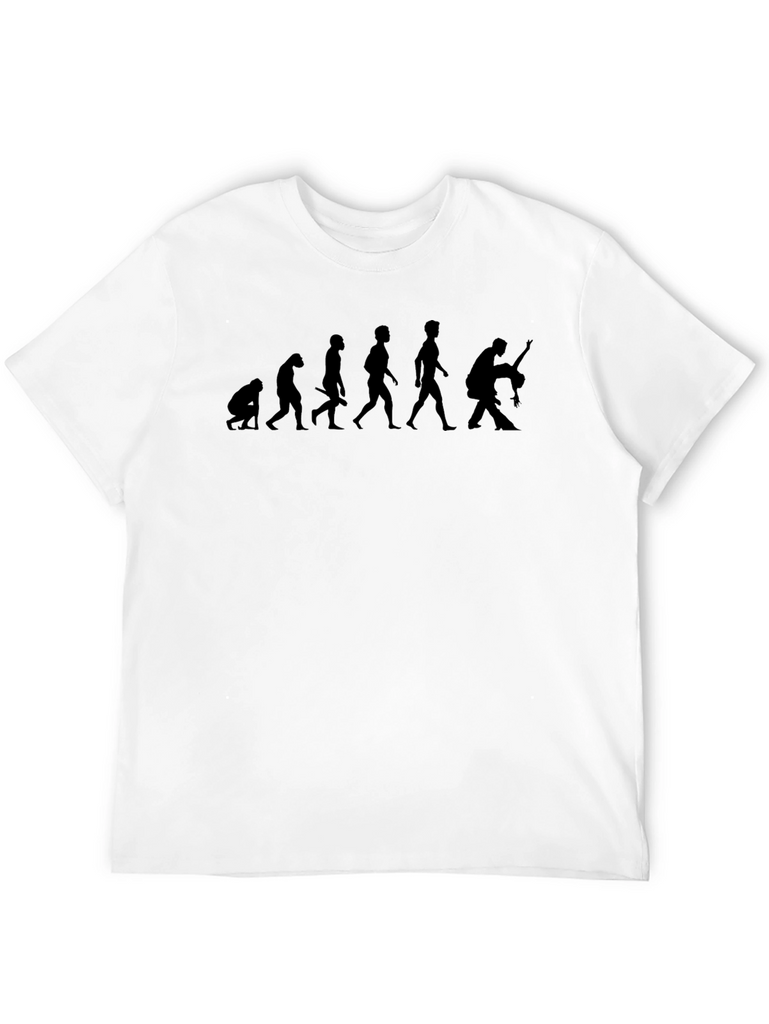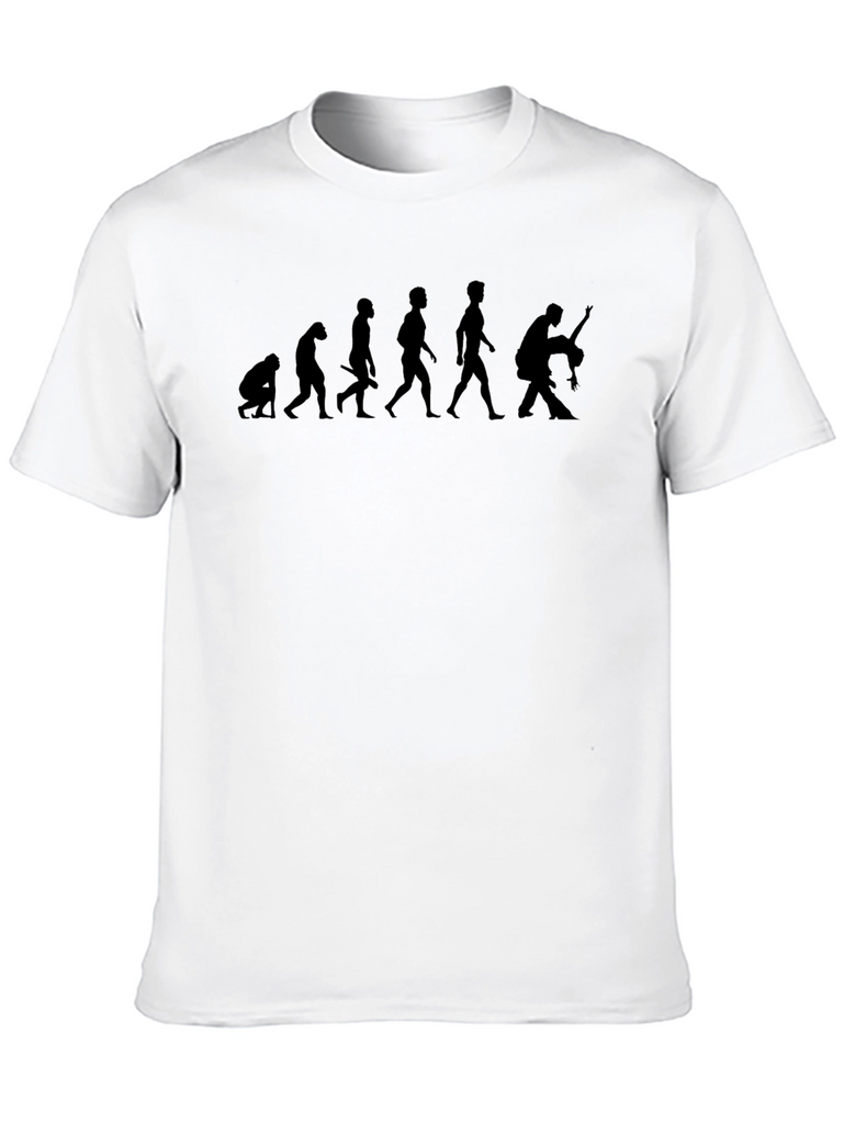 Showcase your love for music with this unique black T-shirt. The shirt features a graphic design illustrating the evolution of humans culminating in a guitarist mid-performance. The design is suitable for casual wear and conversation starting. Made from comfortable materials, this shirt is perfect for everyday use, concerts, or music festivals. Makes a great gift for guitarists, musicians, and music enthusiasts. Pair it with your favorite jeans or shorts for a relaxed, stylish look that expresses your passion for music. The dark color makes it easy to match with any outfit.