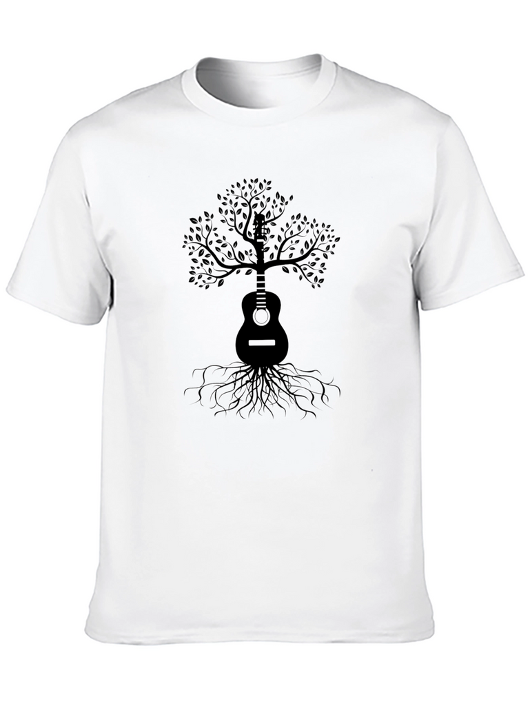 Express your love for music and nature with this unique black graphic tee. The shirt features a striking guitar-shaped tree design, with the guitar body forming the trunk and branches adorned with leaves. Roots extend from the base of the guitar, creating a visual metaphor of music and growth. The solid black color makes the design pop. It is made from a comfortable material, perfect for everyday wear. Ideal for casual outings, music events, or simply expressing your passion, this tee is a must-have for music lovers and nature enthusiasts alike.