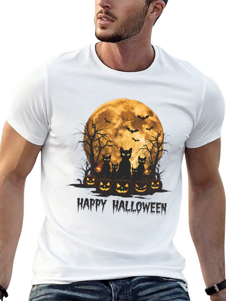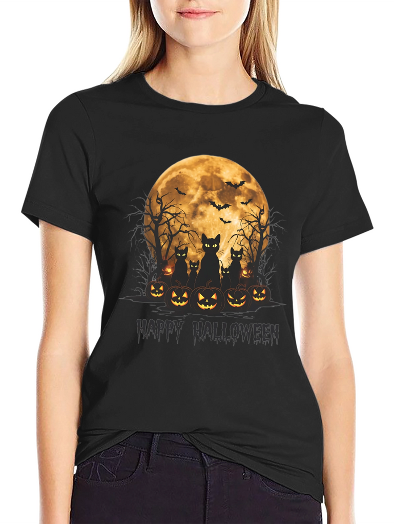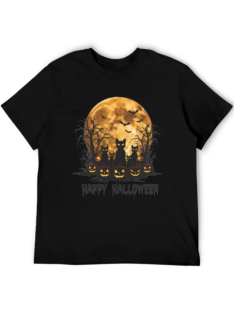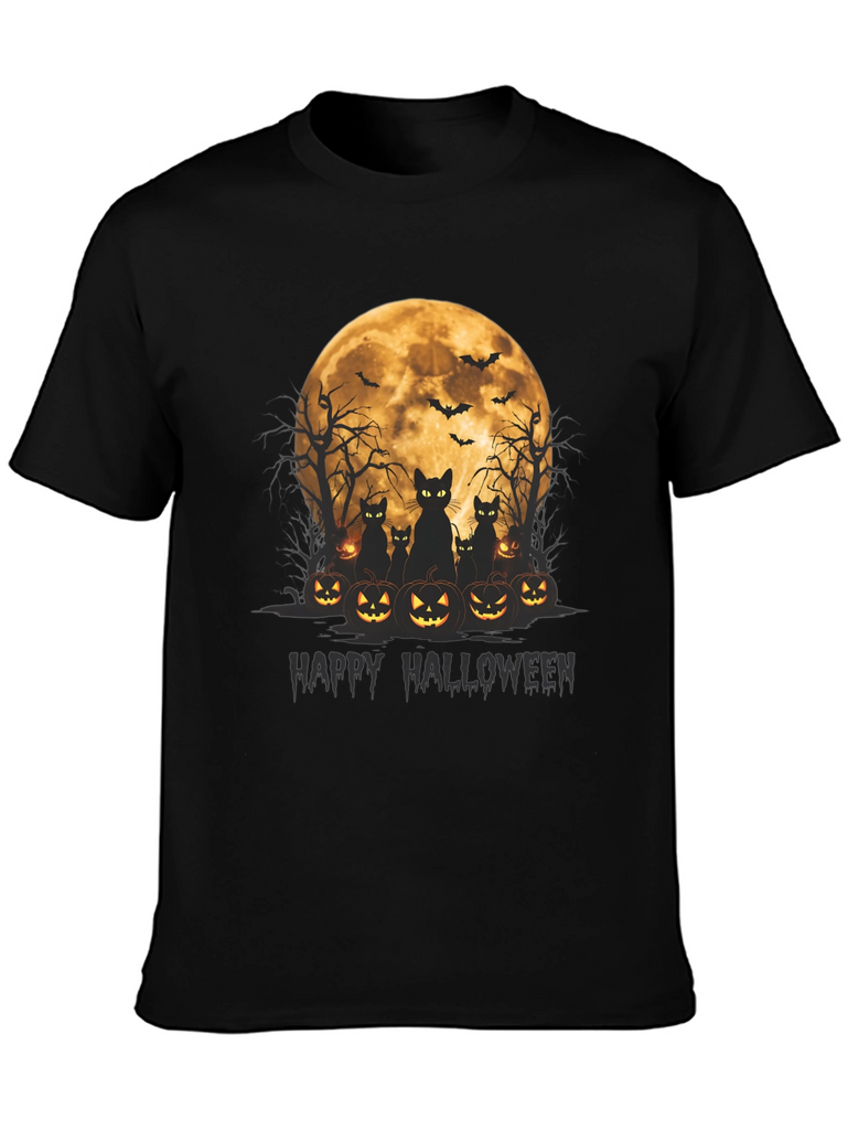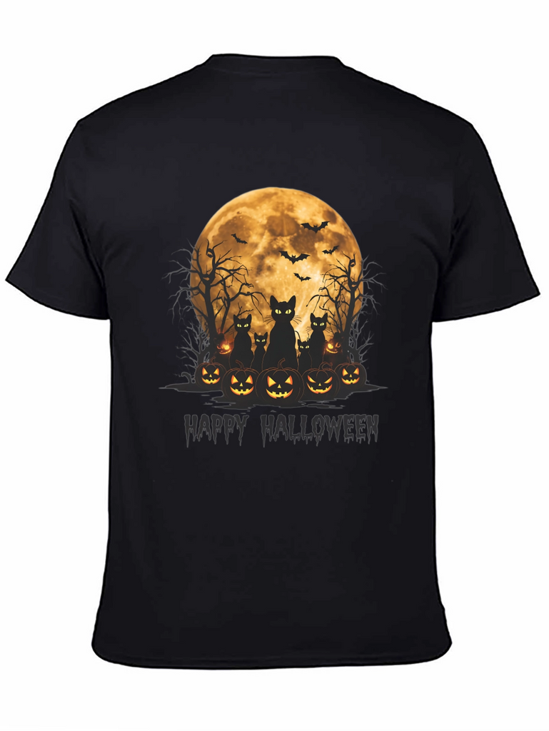 Get spooky in style with this Halloween-themed t-shirt! Featuring a vibrant graphic of black cats silhouetted against a full moon, surrounded by grinning jack-o'-lanterns, this tee is perfect for celebrating the season. Above the cats and pumpkins are spooky bare trees and flying bats that round out the scary scene. The words "Happy Halloween" are written below the image in dark text. Made from soft, comfortable fabric, this black t-shirt is ideal for Halloween parties, trick-or-treating, or just showing off your love for the holiday. Grab yours now and get ready for a frightfully fun time!