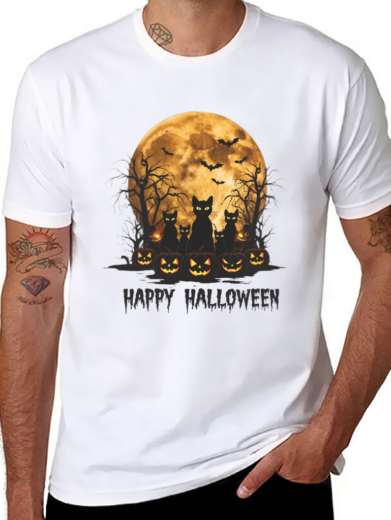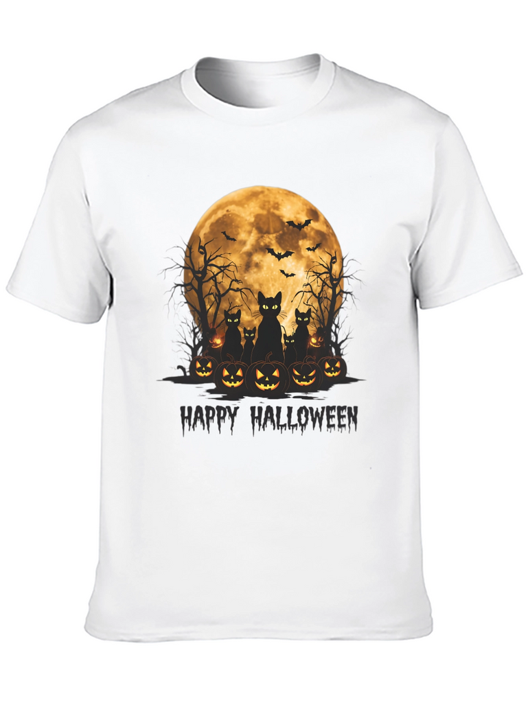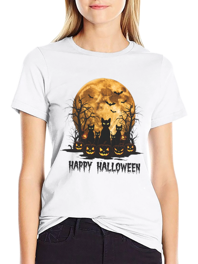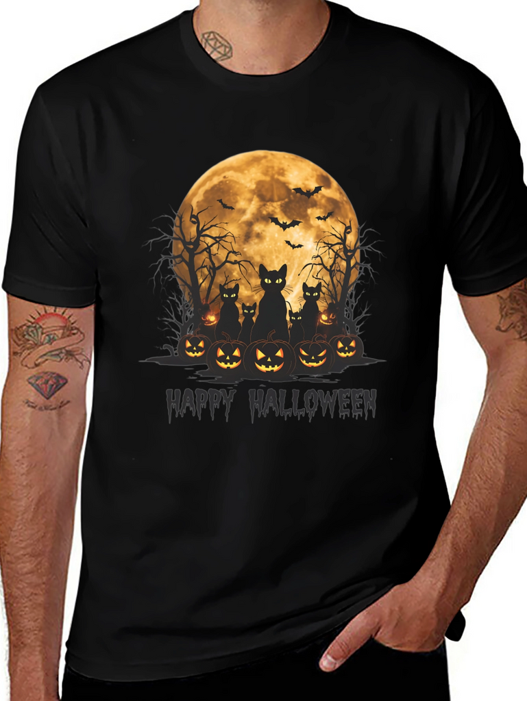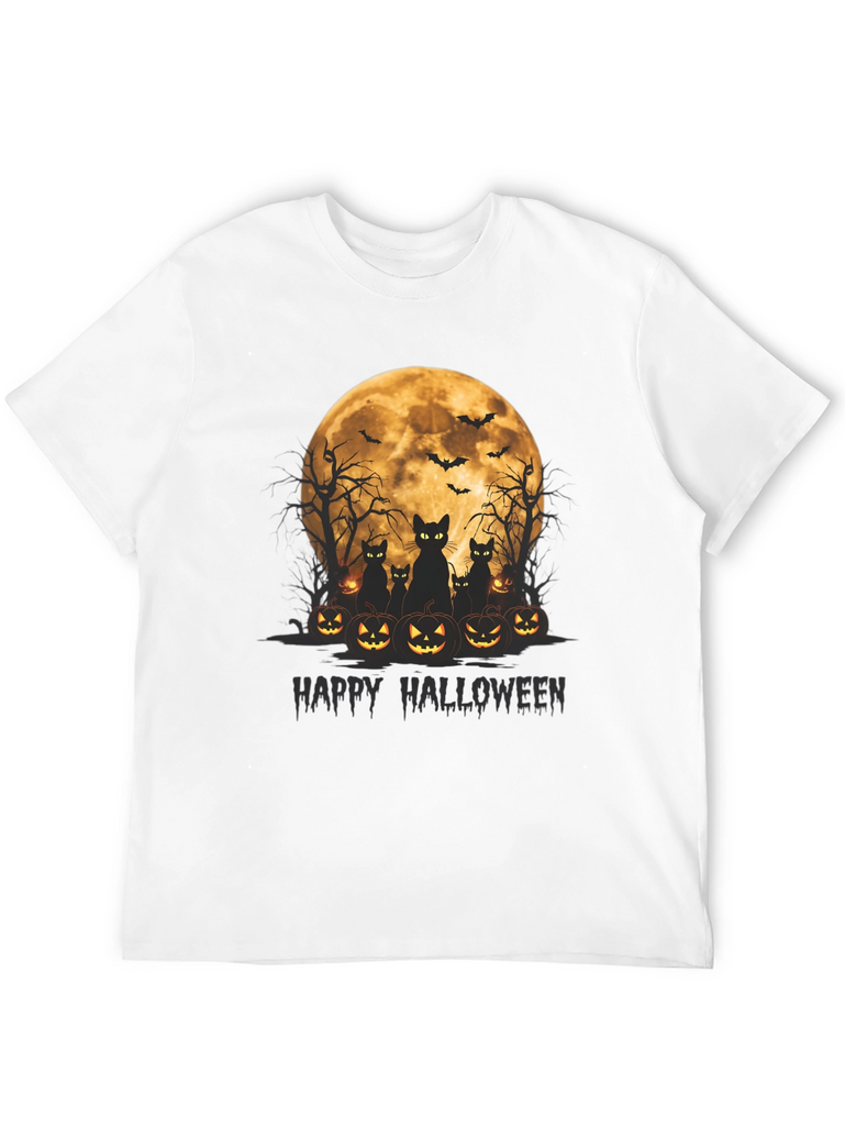 Get spooky in style with this Halloween-themed t-shirt! Featuring a vibrant graphic of black cats silhouetted against a full moon, surrounded by grinning jack-o'-lanterns, this tee is perfect for celebrating the season. Above the cats and pumpkins are spooky bare trees and flying bats that round out the scary scene. The words "Happy Halloween" are written below the image in dark text. Made from soft, comfortable fabric, this black t-shirt is ideal for Halloween parties, trick-or-treating, or just showing off your love for the holiday. Grab yours now and get ready for a frightfully fun time!