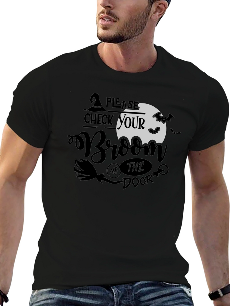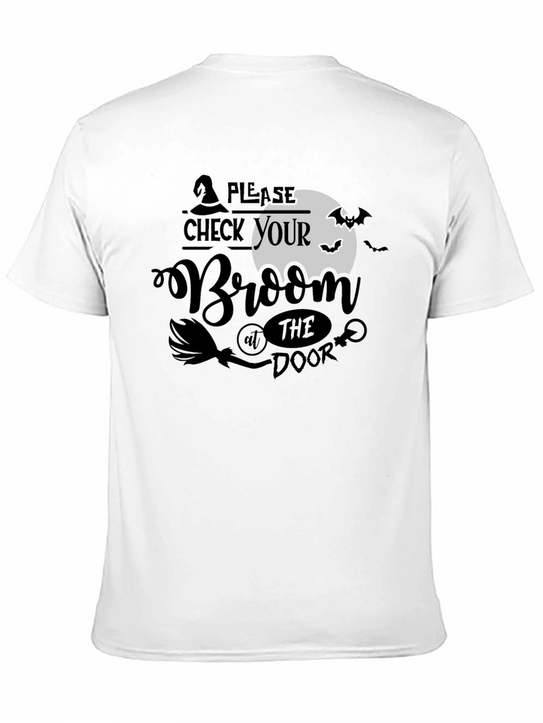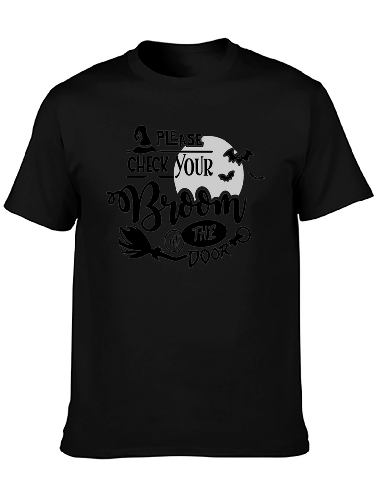 Get ready for Halloween with this festive black graphic tee! Featuring a playful design of a witch's hat, moon, bats, and broom, along with the cheeky phrase "Please Check Your Broom at the Door," this shirt is perfect for Halloween parties or everyday spooky style. The print is high-quality and appears durable. Made from a soft-looking fabric, it ensures comfort for all-day wear. This Tee is Ideal for Halloween enthusiasts and anyone looking to add a touch of humor to their wardrobe. Show off your love for Halloween with this must-have tee!