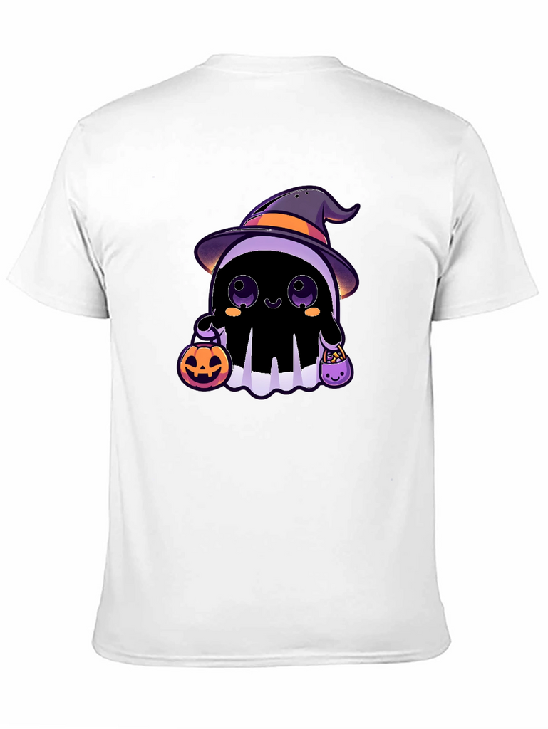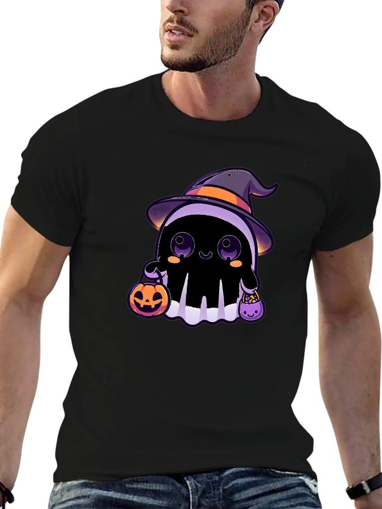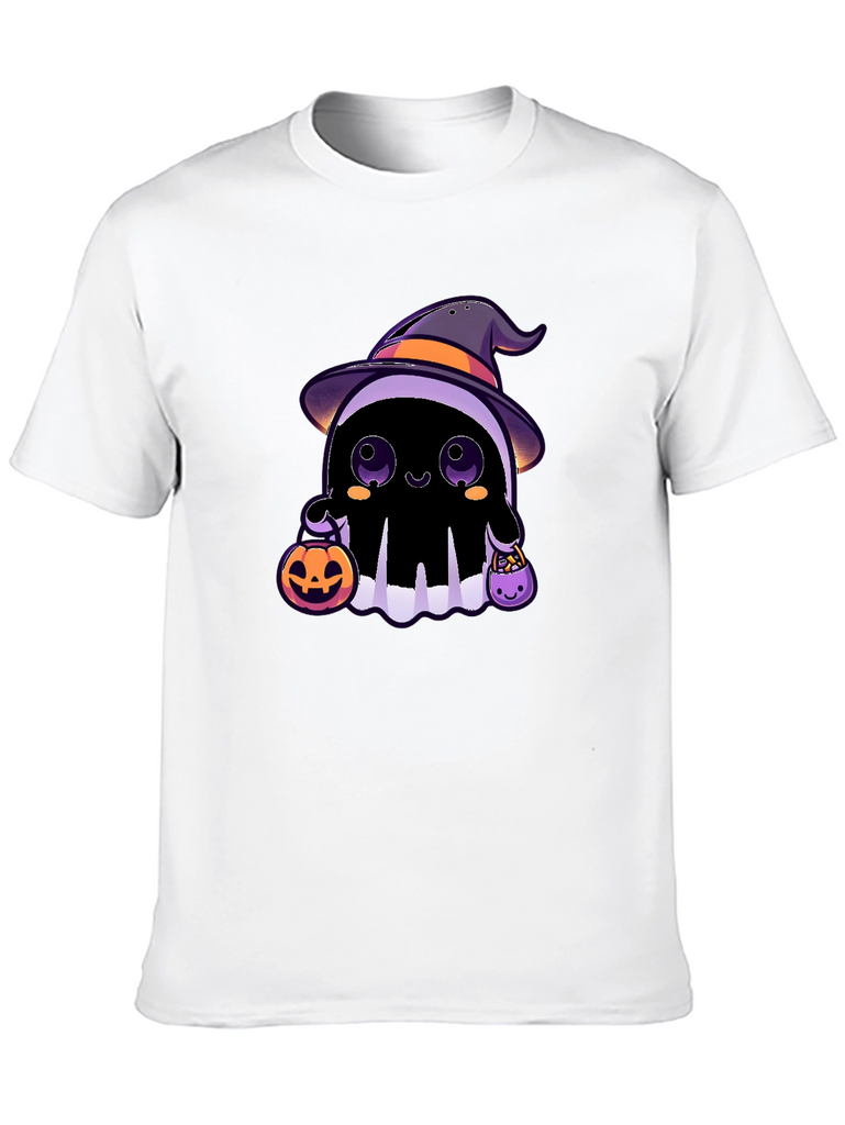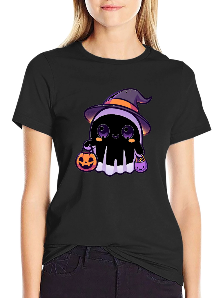 Get ready for spooky season with this adorable Halloween-themed t-shirt! Featuring a cute cartoon ghost wearing a witch's hat, this shirt is perfect for anyone who loves Halloween but prefers a playful, less scary vibe. The ghost is carrying a pumpkin, ready for trick-or-treating. The design is printed on a soft, comfortable black t-shirt, making it great for everyday wear during the fall season. Whether you're attending a Halloween party, going trick-or-treating, or just want to show off your holiday spirit, this shirt is a must-have. It's a fun and festive way to celebrate Halloween!