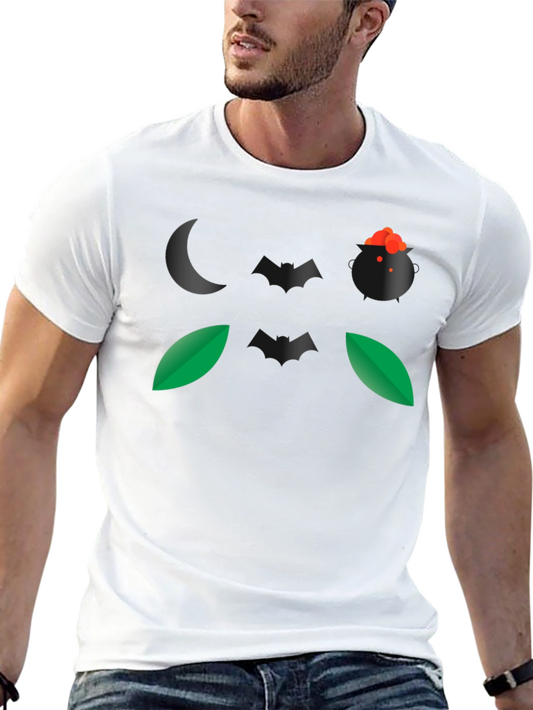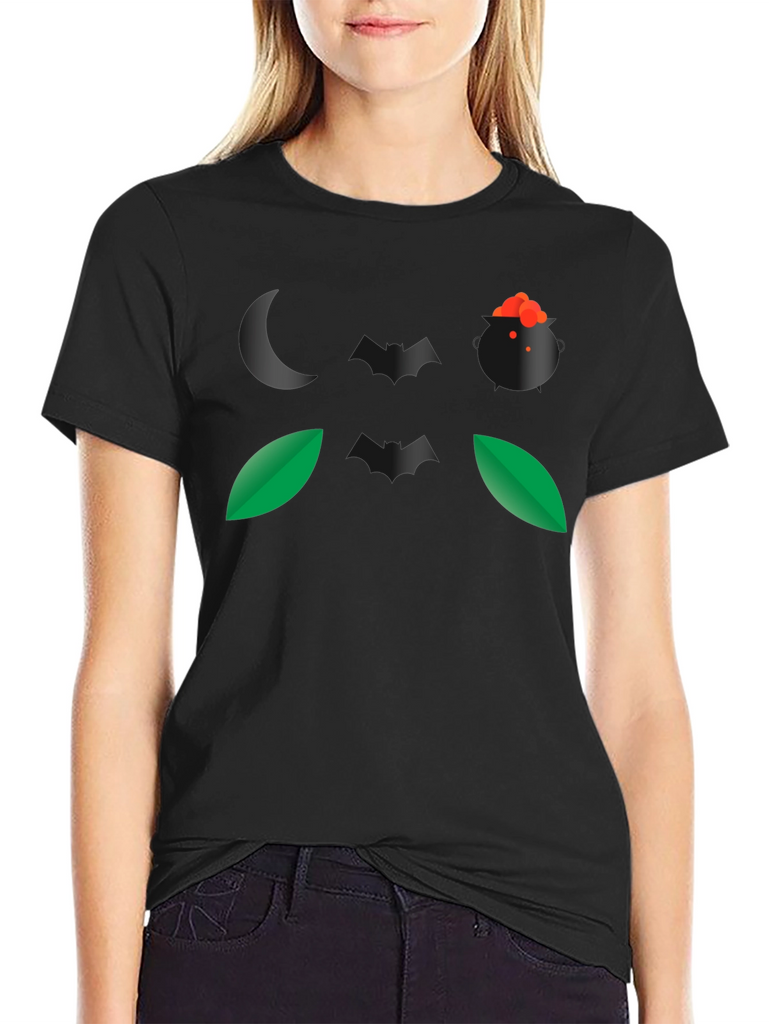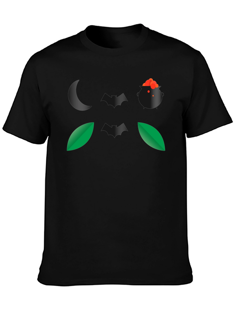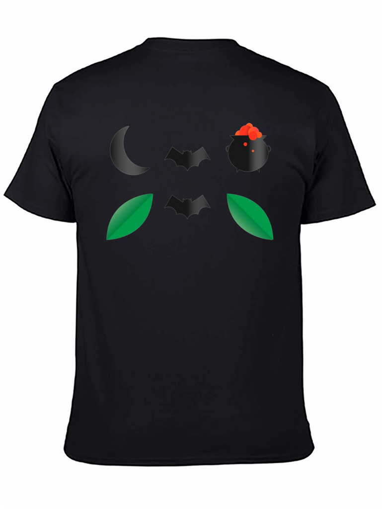 Embrace the spirit of Halloween with this eye-catching black t-shirt. The design features a spooky night-themed graphic, including a crescent moon, a witch's cauldron bubbling with a potion, bats, and leaves. Made from a comfortable, breathable fabric, this t-shirt is perfect for casual wear during the spooky season. Its unique graphic makes it a conversation starter at Halloween parties or while trick-or-treating. Show off your love for Halloween with this stylish and comfortable tee. This t-shirt is a great way to add some spooky flair to your wardrobe.