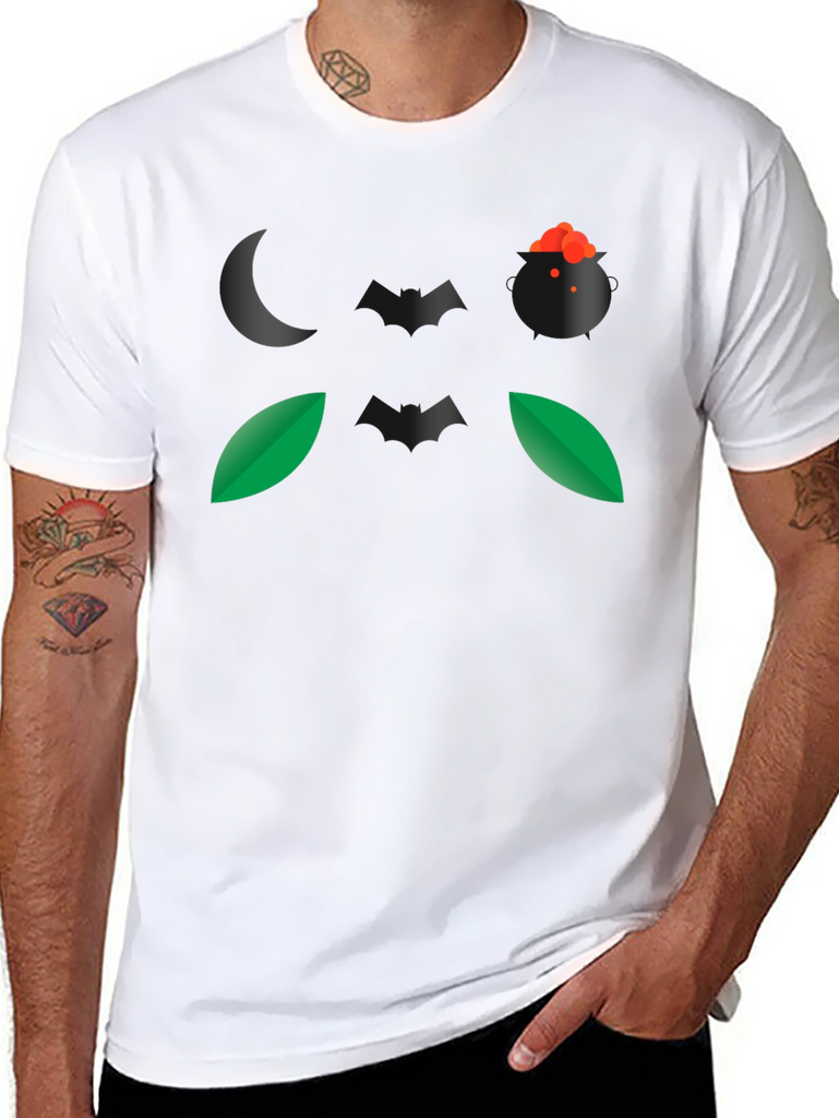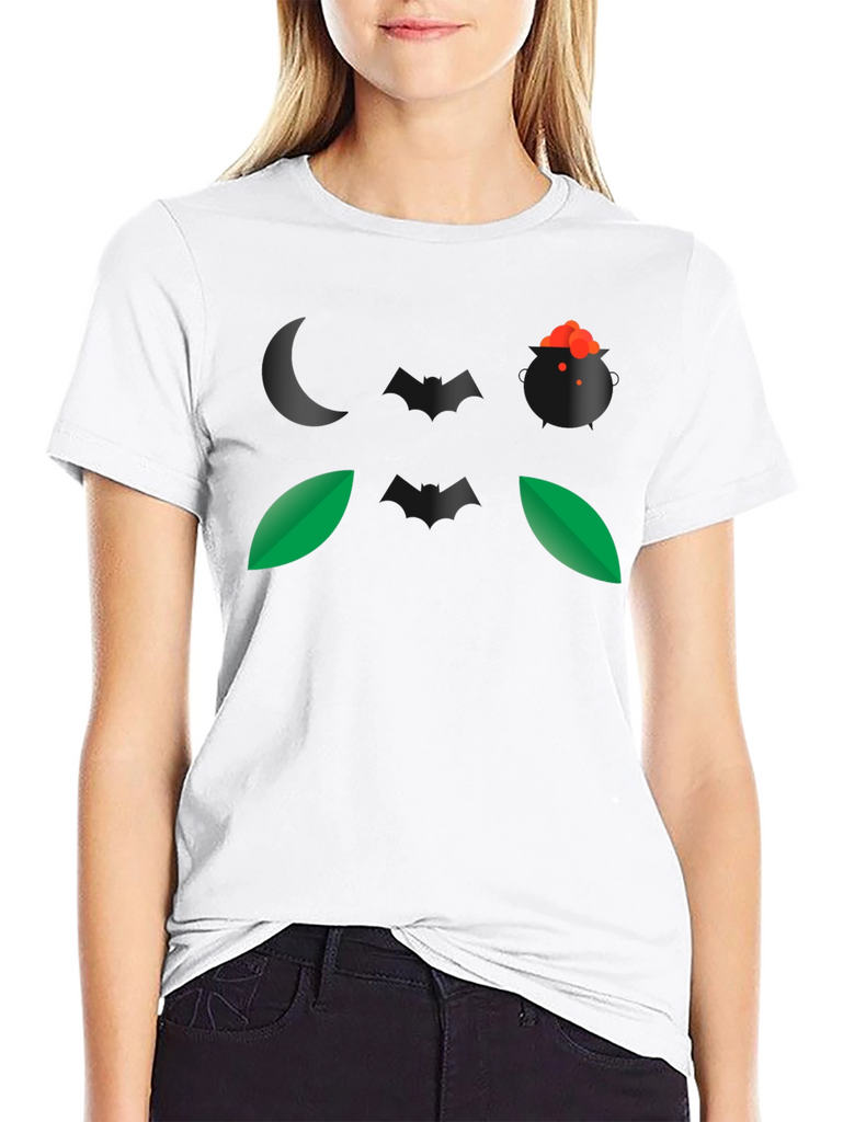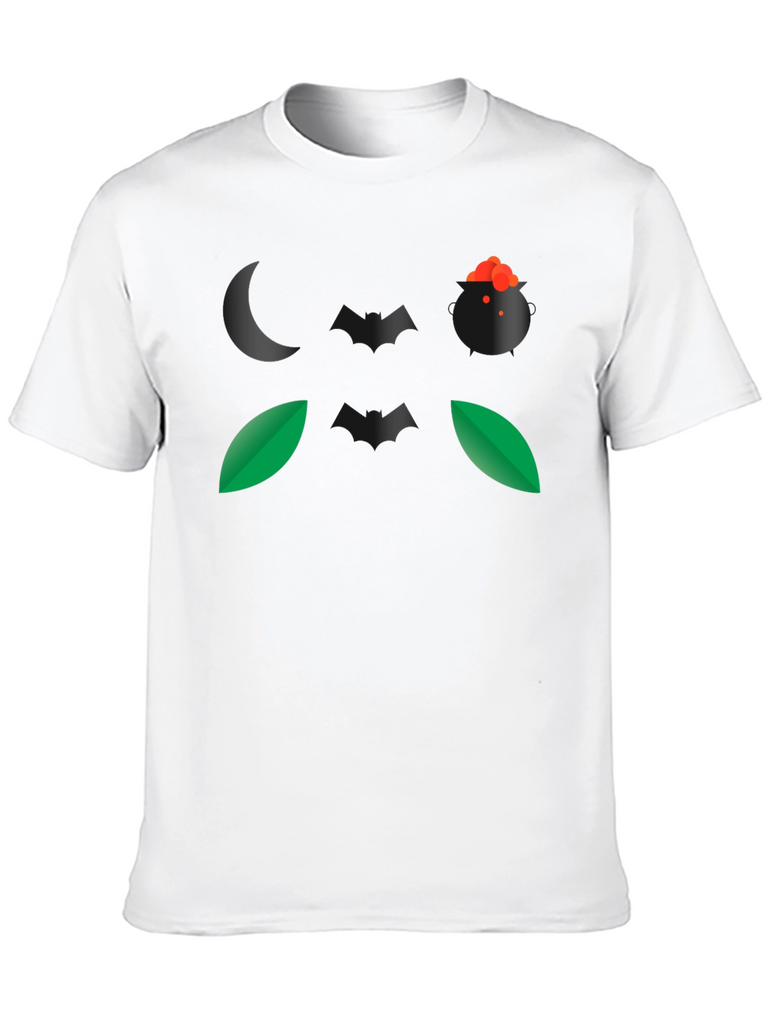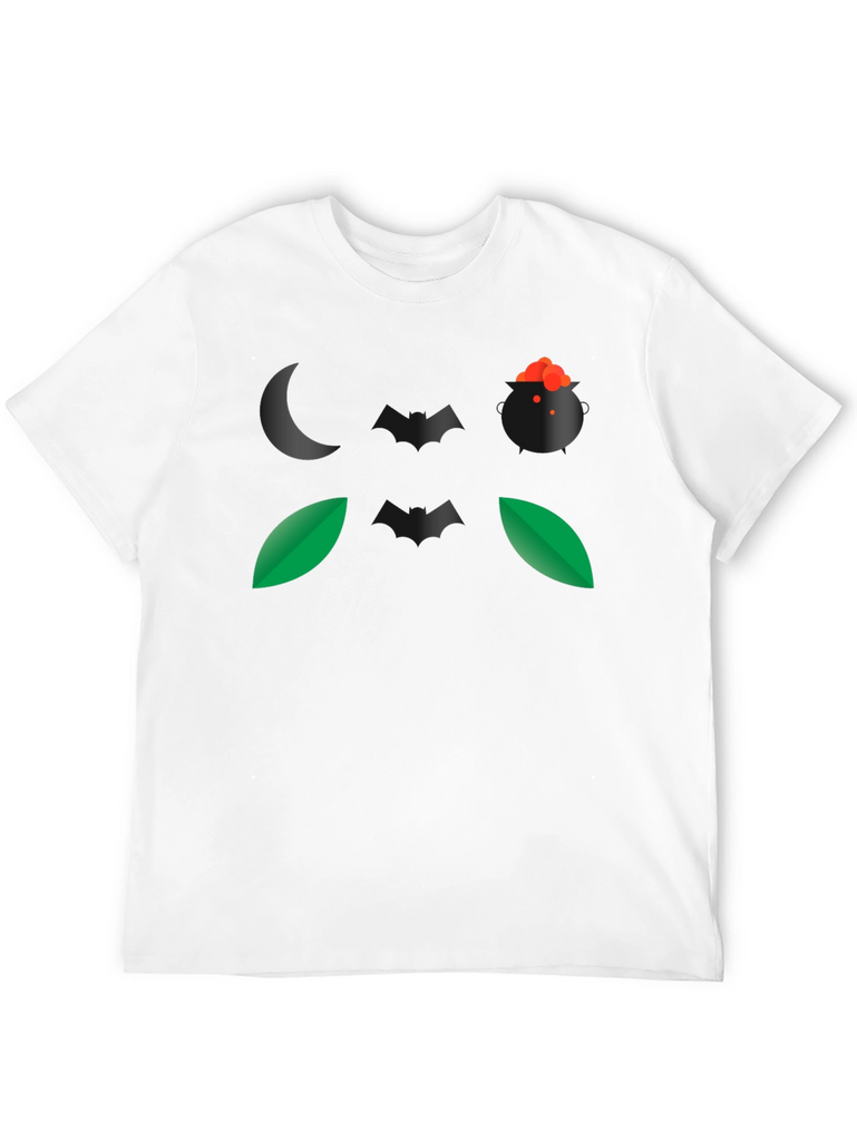 Embrace the spirit of Halloween with this eye-catching black t-shirt. The design features a spooky night-themed graphic, including a crescent moon, a witch's cauldron bubbling with a potion, bats, and leaves. Made from a comfortable, breathable fabric, this t-shirt is perfect for casual wear during the spooky season. Its unique graphic makes it a conversation starter at Halloween parties or while trick-or-treating. Show off your love for Halloween with this stylish and comfortable tee. This t-shirt is a great way to add some spooky flair to your wardrobe.