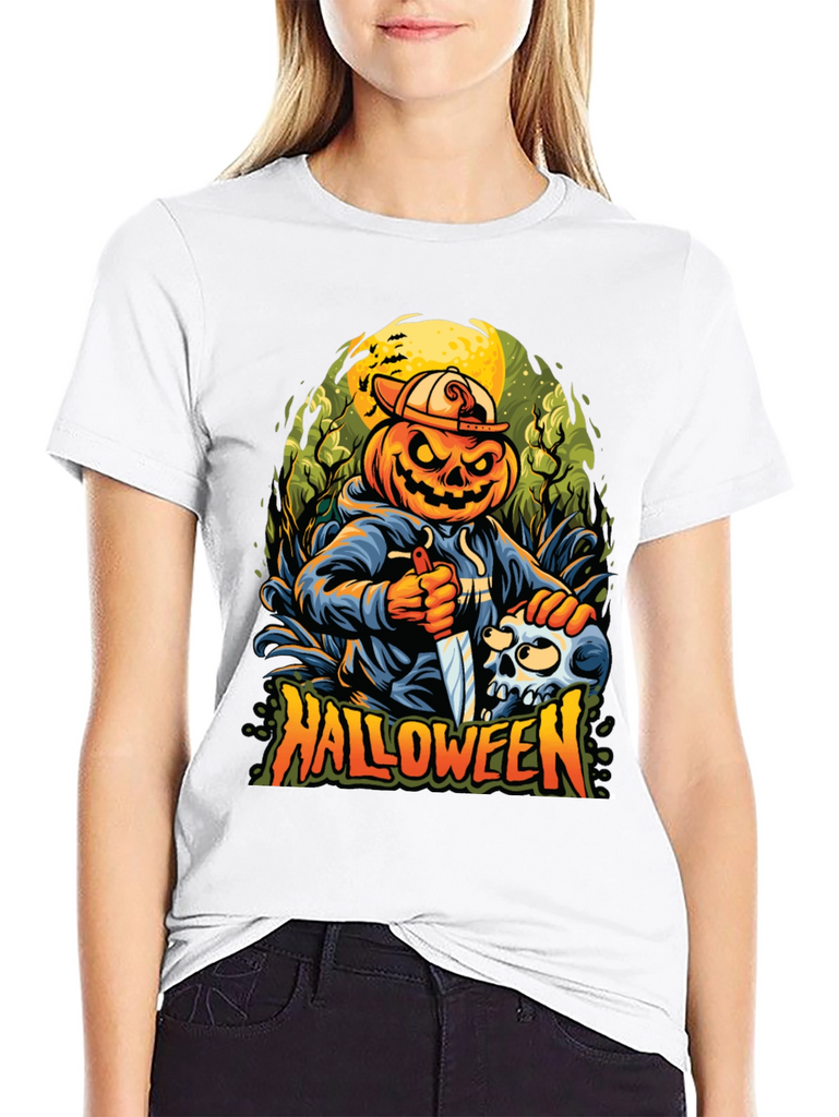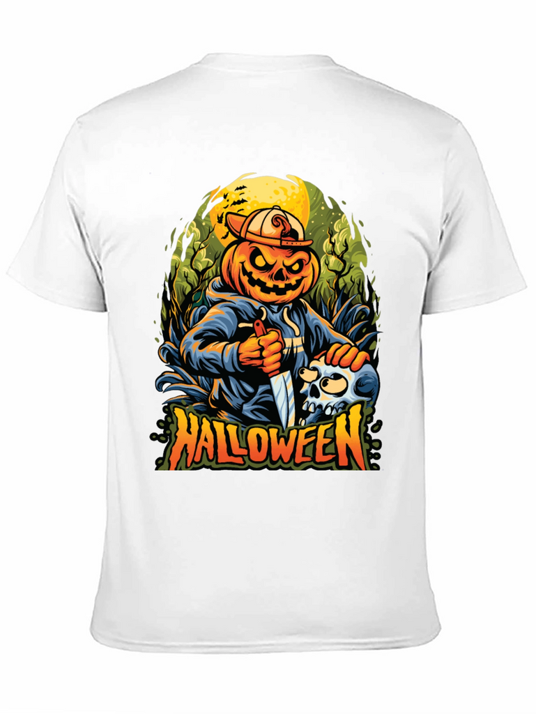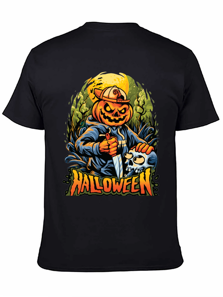 Get ready for spooky season with this bold graphic tee. This black t-shirt features a vibrant Halloween-themed design with a sinister pumpkin character wearing a backwards cap and holding a knife over a skull, set against a spooky moonlit background. The word "HALLOWEEN" is displayed at the bottom. Perfect for Halloween parties, trick-or-treating, or casual wear. Made from a comfortable and durable fabric, this tee is sure to make a statement wherever you go. This tee provides a chillingly stylish look for your Halloween wardrobe.