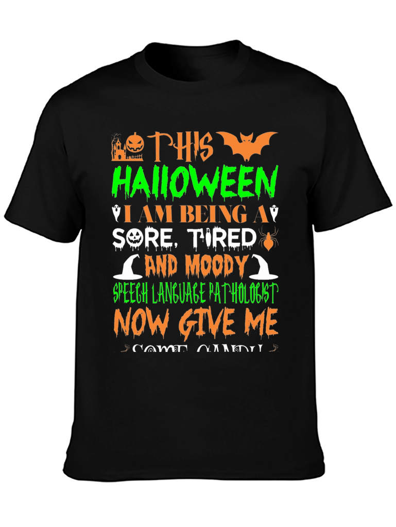 Show off your spooky spirit with this Halloween-themed t-shirt! Made from a soft, breathable black fabric, this comfortable shirt features a vibrant and playful graphic design. In orange and green Halloween colors, the design showcases a fun message: "This Halloween I am being a sore, tired, and moody speech language pathologist now give me some candy!" Perfect for speech therapists celebrating Halloween, this tee is sure to get you noticed. Wear it to work, Halloween parties, or while trick-or-treating with the kids. This unique shirt is a festive way to express your love for Halloween and your profession!