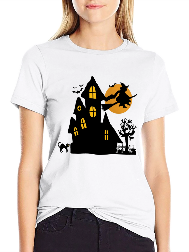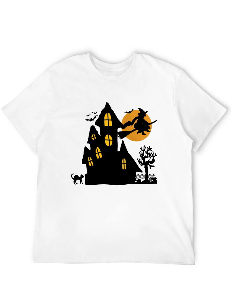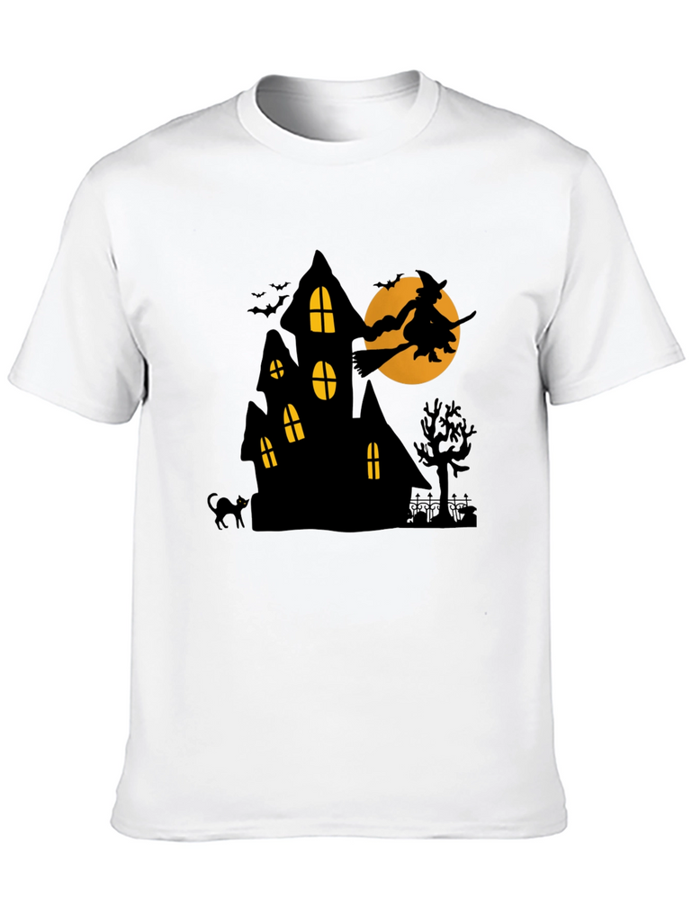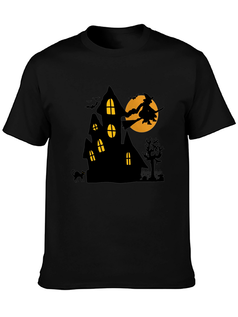 Get spooky with this unique Halloween-themed t-shirt! This black tee features a bold graphic of a haunted house silhouetted against an orange moon. A witch on a broomstick flies across the moon, adding a touch of classic Halloween charm. Bats, a black cat, and a spooky tree complete the scene. The shirt is made from a comfortable-looking material, perfect for Halloween parties, trick-or-treating, or just showing off your love for the holiday. It's a fun and festive way to celebrate the season!