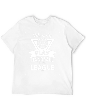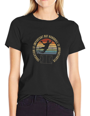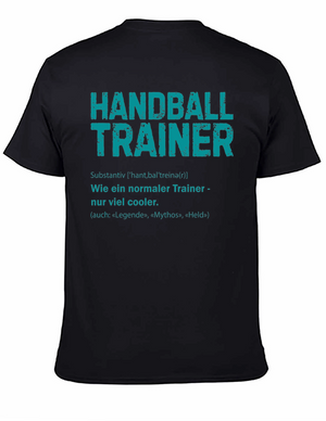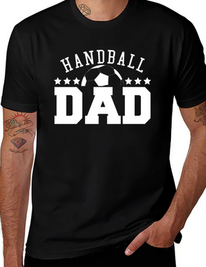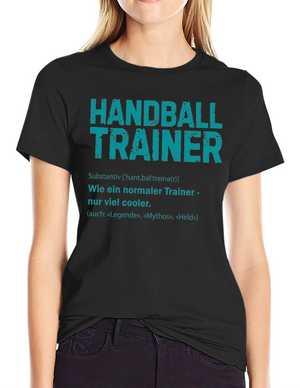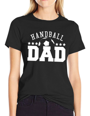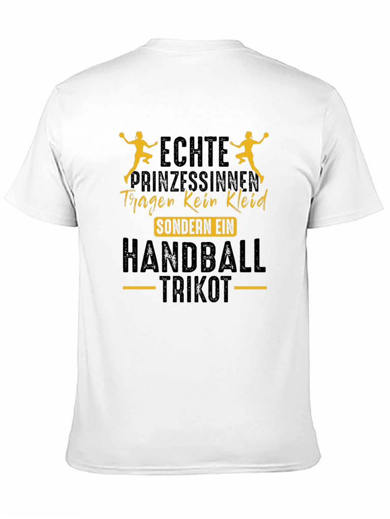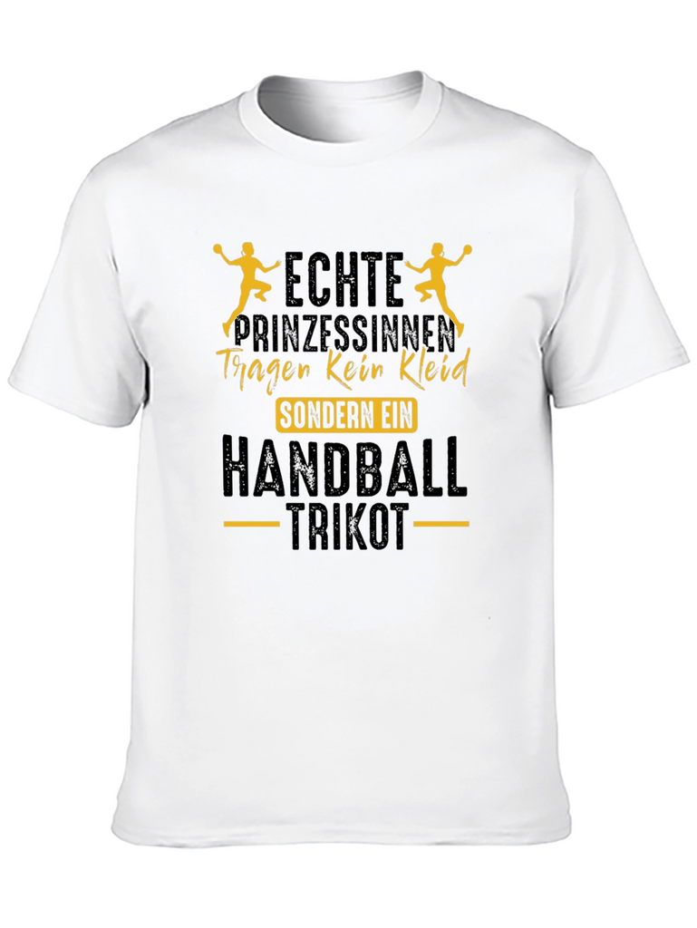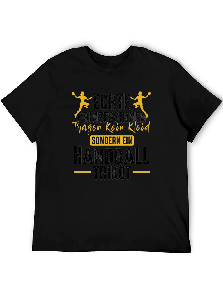 This black t-shirt features a striking design with the German phrase "Echte Prinzessinnen tragen kein Kleid, sondern ein Handball Trikot," translating to "Real Princesses don't wear dresses, but a Handball Jersey." The design incorporates two golden handball player silhouettes, highlighting the sporty theme. The text is in a bold, golden font. Made from a comfortable-looking fabric, this tee is perfect for handball enthusiasts who want to express their passion for the sport with a touch of humor and style. It's ideal for casual wear, handball practice, or showing team spirit at games.