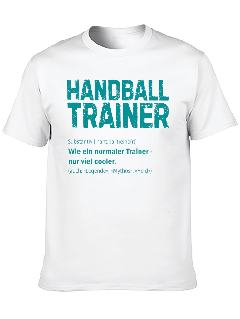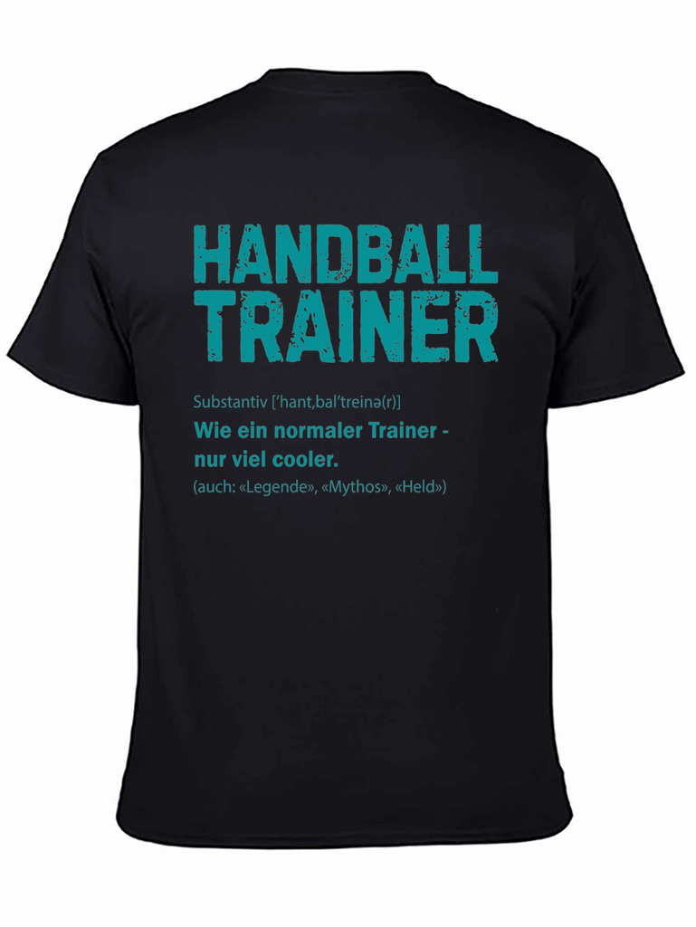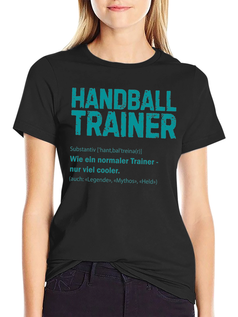 Show your appreciation for a handball coach with this unique t-shirt. The shirt features a humorous "definition" of a handball trainer, stating that they are "like a normal trainer - only much cooler!" and also a legend, mythos and hero. The design is printed in blue on a black, presumably soft and comfortable t-shirt. This tee is perfect for coaches who have a good sense of humor and a love for their sport. It's a great gift idea for birthdays, end-of-season celebrations, or just to show your thanks. Wear it to training sessions, matches, or casually around town.