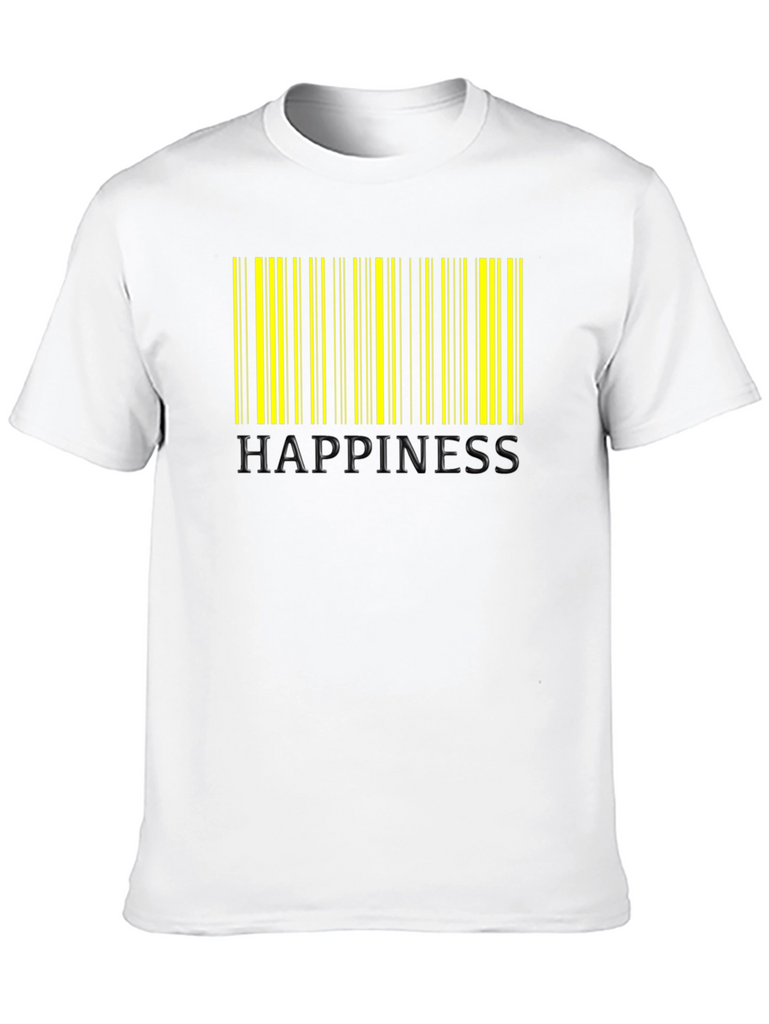 Showcase your unique style with this eye-catching black t-shirt featuring a vibrant yellow barcode design. Below the barcode is the word "HAPPINESS" embossed into the shirt. Made from a soft and comfortable fabric, this tee is perfect for everyday wear. The classic crew neck and short sleeves offer a relaxed fit, while the bold graphic print adds a touch of individuality to your look. This t-shirt is an ideal choice for casual outings, concerts, or simply expressing your personality. Pair it with jeans, shorts, or a skirt for a versatile and trendy ensemble.