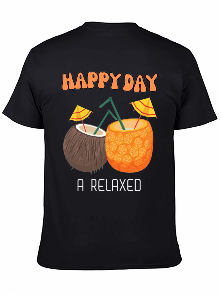 Embrace the island vibes with this fun and stylish black T-shirt. Featuring a playful design of tropical cocktails, including a coconut and pineapple drink, complete with umbrellas and straws. The text "HAPPY DAY A RELAXED" adds to the relaxed and cheerful feel. Made from comfortable fabric, it's perfect for casual wear, vacations, or adding a touch of summer to your everyday look. Stand out with this unique and eye-catching tee!