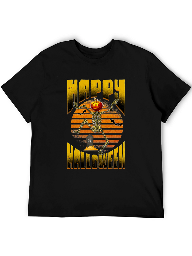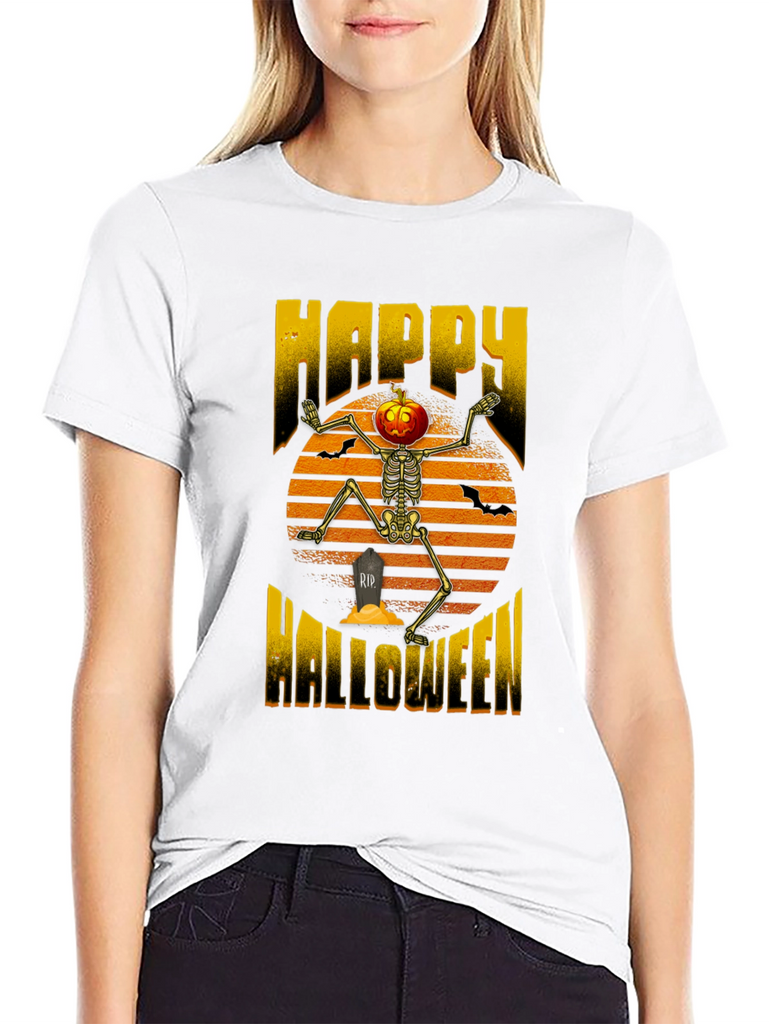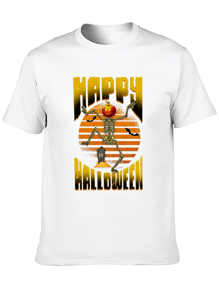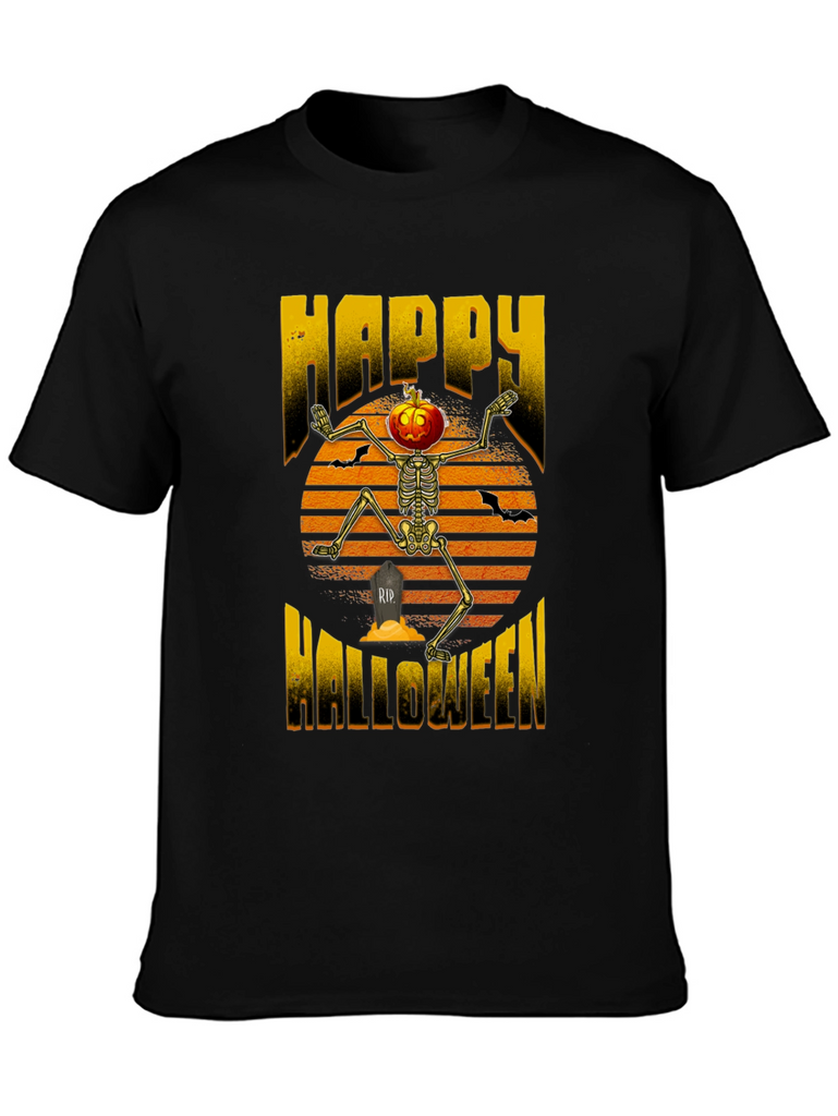 Get ready for Halloween with this eye-catching t-shirt! Featuring a spooky yet fun design, the shirt showcases a skeleton figure with a pumpkin head, set against a retro sunset backdrop. The words 'Happy Halloween' are prominently displayed. Ideal for Halloween parties, trick-or-treating, or casual wear during the spooky season, this t-shirt is sure to turn heads. Made from comfortable, breathable fabric, it's perfect for all-night festivities or everyday wear. Show off your Halloween spirit in style with this unique and festive t-shirt!