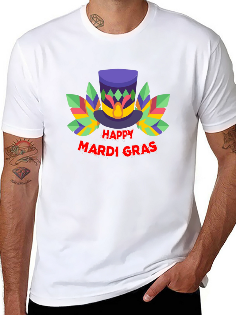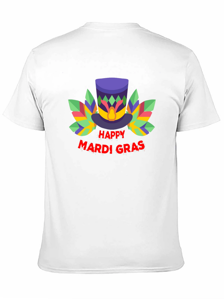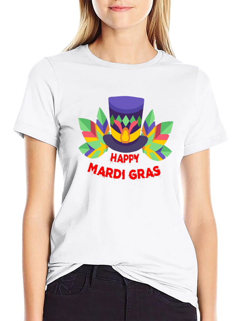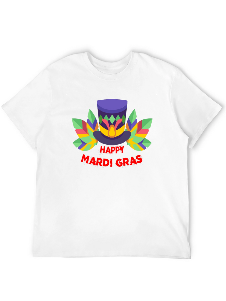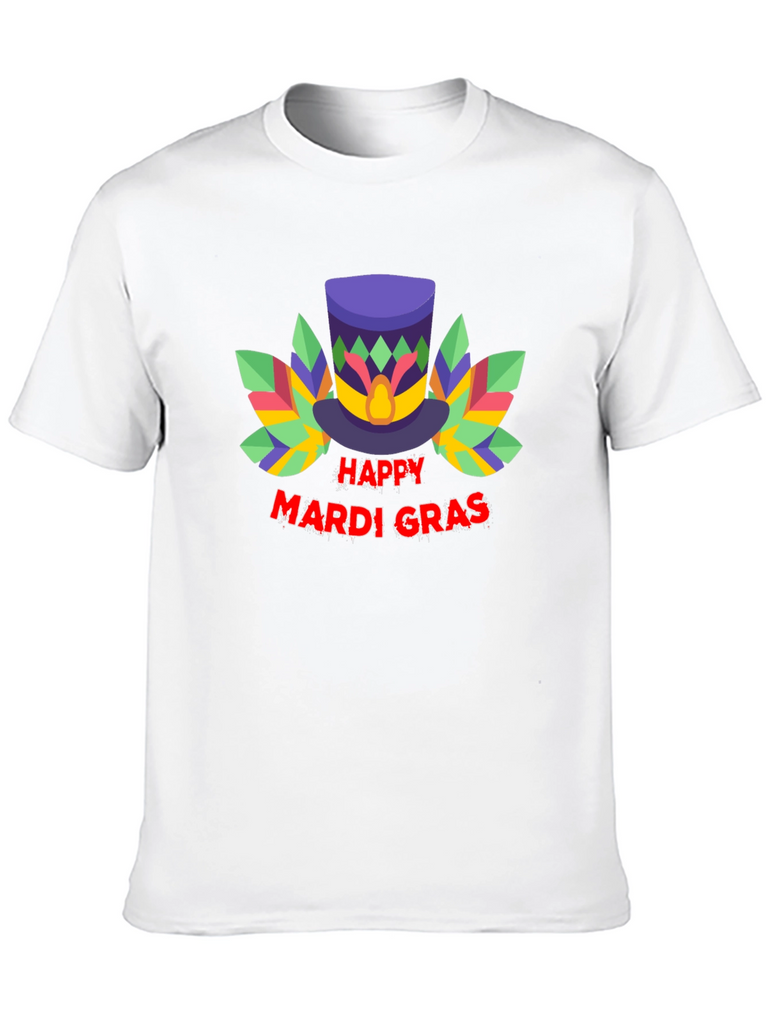 Celebrate Mardi Gras in style with this eye-catching black T-shirt. Featuring a vibrant design with a top hat, colorful feathers, and the words "Happy Mardi Gras" in bold red text, this tee is perfect for any festive occasion. The shirt appears to be made from a comfortable, soft material, making it ideal for all-day wear. Show off your love for the holiday and stand out from the crowd with this unique and fun Mardi Gras T-shirt. Great for parties, parades, and everyday wear during the Mardi Gras season.