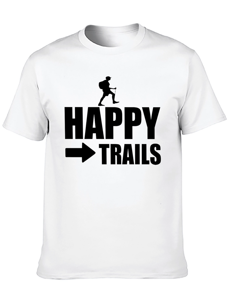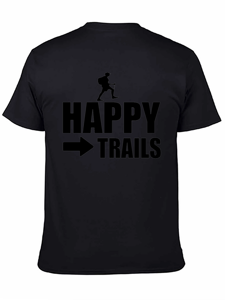 Embark on your next adventure in style with this 'Happy Trails' graphic tee. The design features a silhouetted hiker, an arrow and bold lettering, perfect for outdoor enthusiasts. Made from a soft, comfortable fabric, this T-shirt is ideal for hiking, camping, or everyday wear. Its casual design pairs well with jeans or shorts. Show off your love for the great outdoors with this unique and comfortable shirt. Available in black.