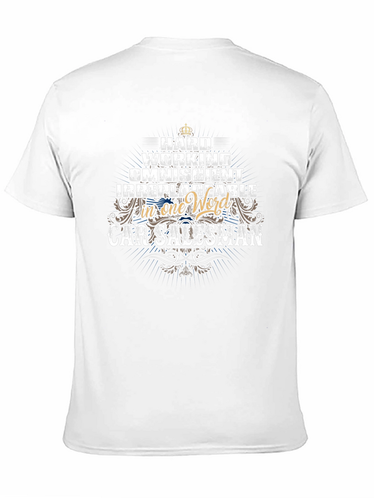 This black t-shirt features a bold graphic design. The statement "Hard Working Omniscient Irreplaceable" is prominently displayed, above "in one word" and "Car Salesman". It suggests a humorous yet confident personality. The shirt appears to be made from a comfortable, breathable fabric, perfect for everyday wear. This t-shirt is a great conversation starter and a fun way to express yourself. Ideal for casual outings, car meets, or even as a gift for the car salesman in your life, this shirt combines style and personality effortlessly. Get ready to make a statement and show off your car salesman pride!