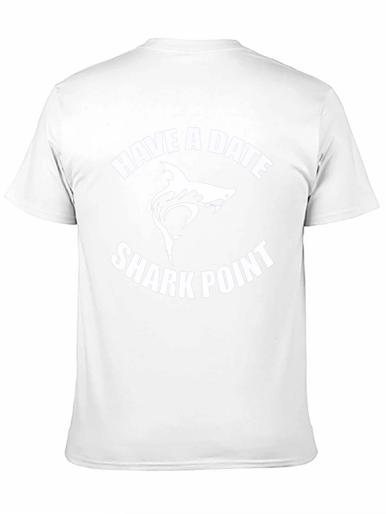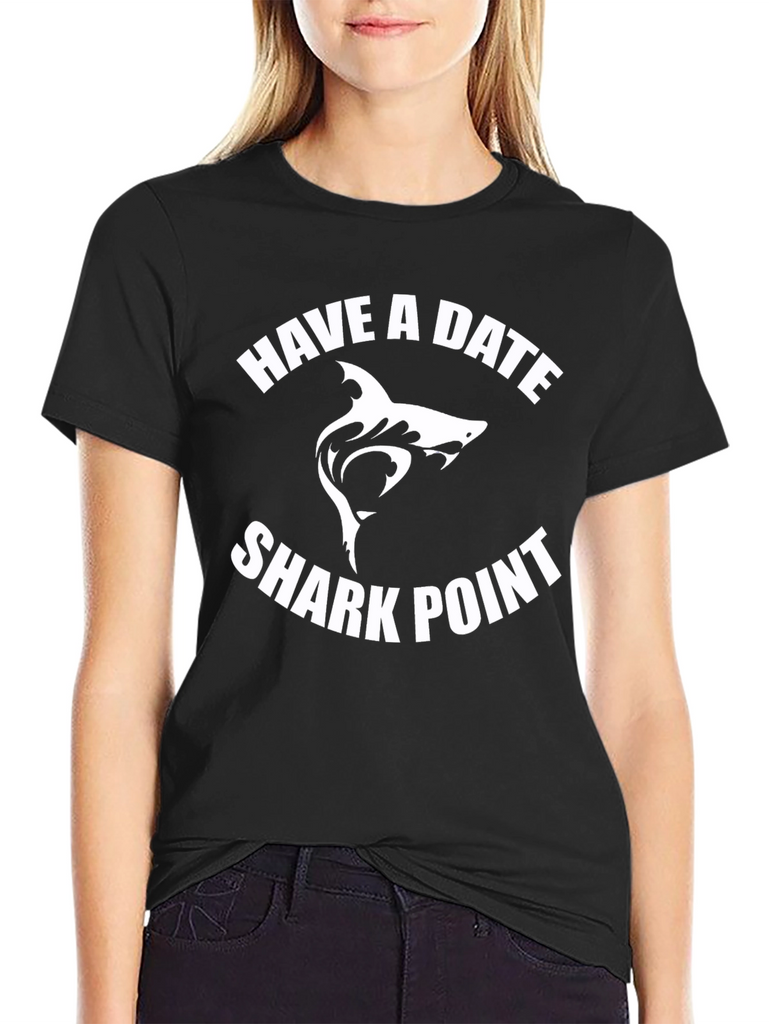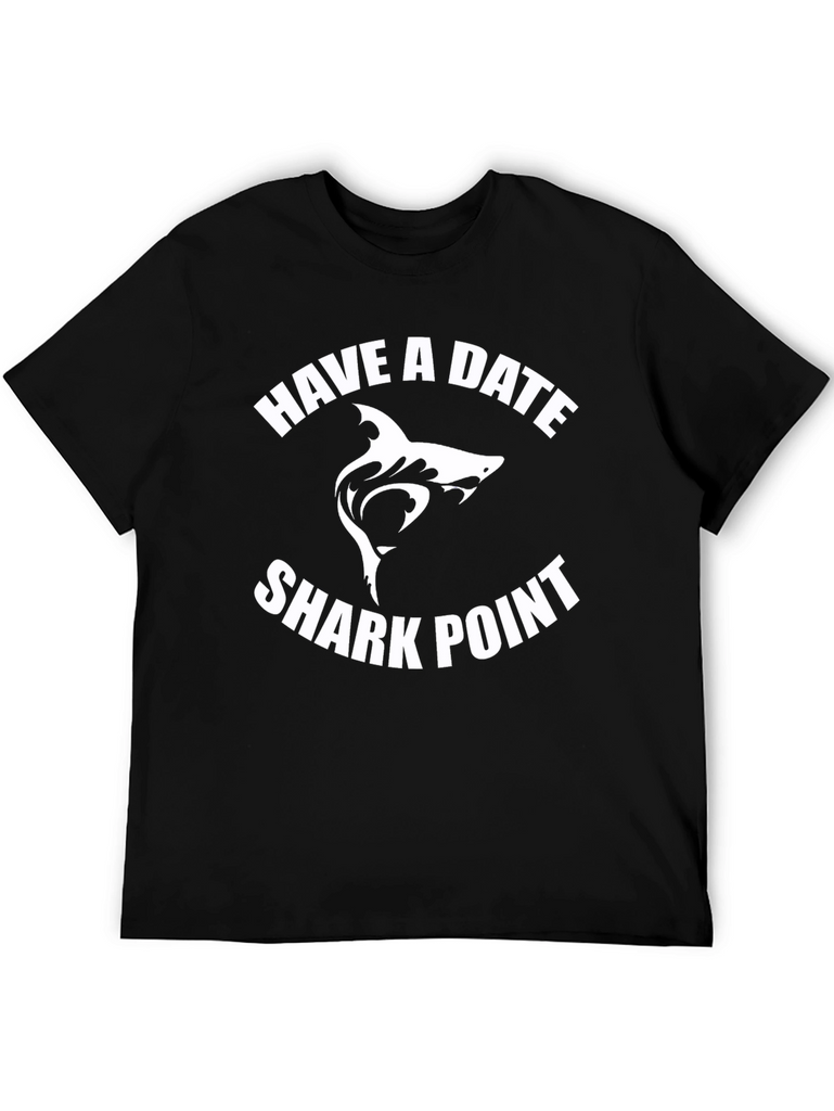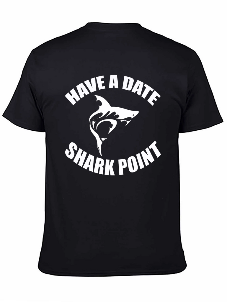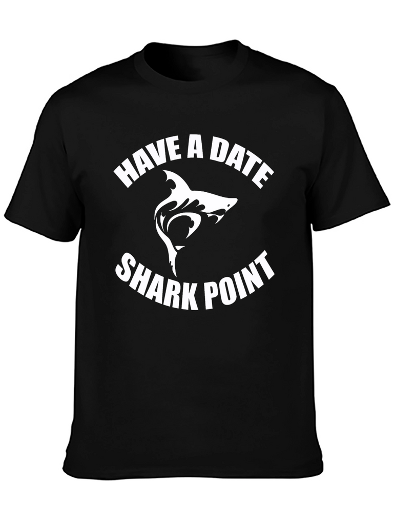 Make a statement with this bold black t-shirt featuring a unique "Have a Date Shark Point" graphic. The design showcases a stylized white shark silhouette between arched text, creating an eye-catching and memorable visual. Made from what appears to be a soft and breathable cotton blend, this tee offers both style and comfort. Its classic fit makes it perfect for casual wear, whether you're heading to the beach, hanging out with friends, or just expressing your love for marine life. Pair it with jeans, shorts, or even dress it up under a jacket for a versatile and standout look.