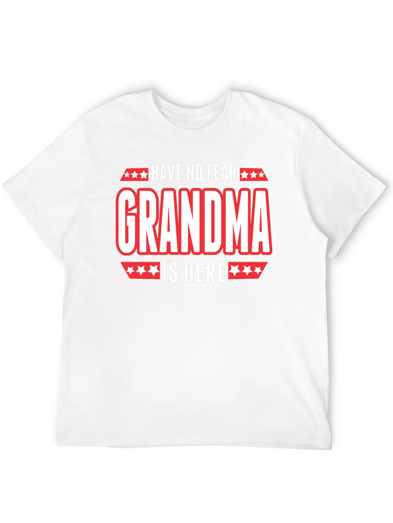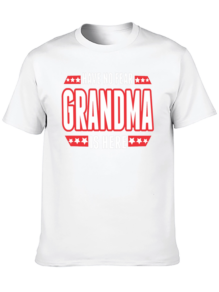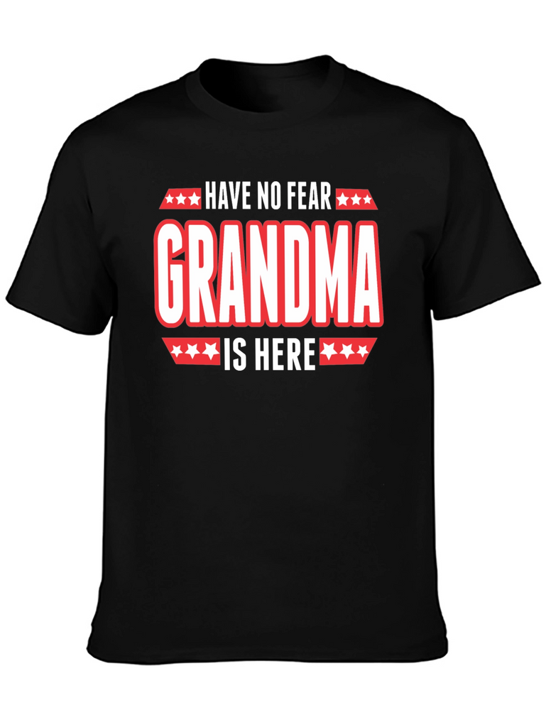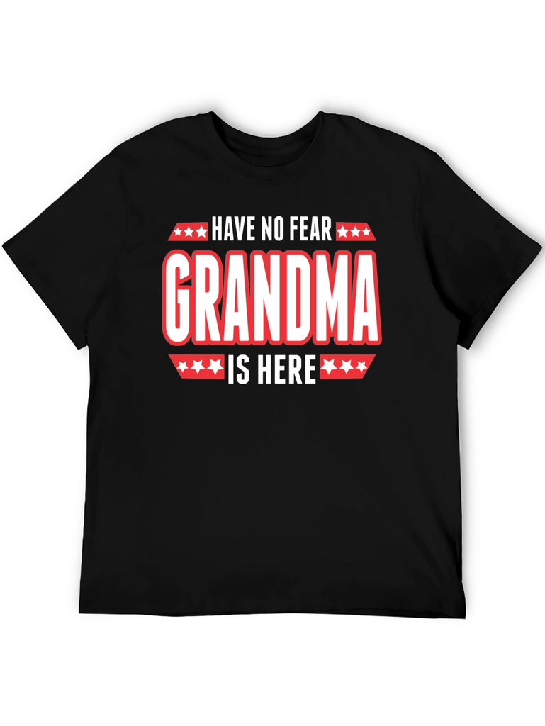 Show your love for grandma with this stylish black t-shirt. The bold graphic design features the phrase "HAVE NO FEAR GRANDMA IS HERE" in a striking red and white font, framed by star accents. Made from a comfortable and breathable fabric, this tee is perfect for everyday wear. Let everyone know how much you appreciate grandma's love and support with this unique and eye-catching shirt. Whether you're running errands or spending quality time together, this t-shirt is a fun way to celebrate your favorite grandma.