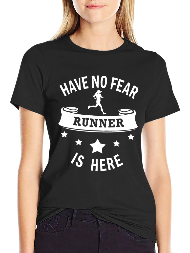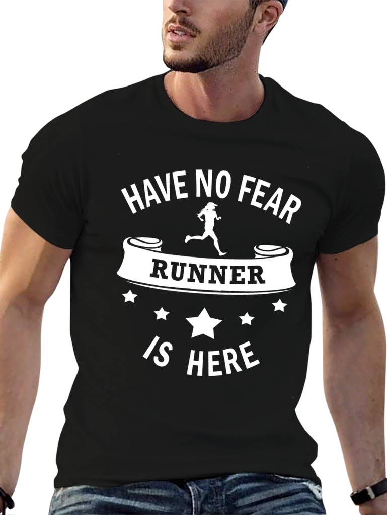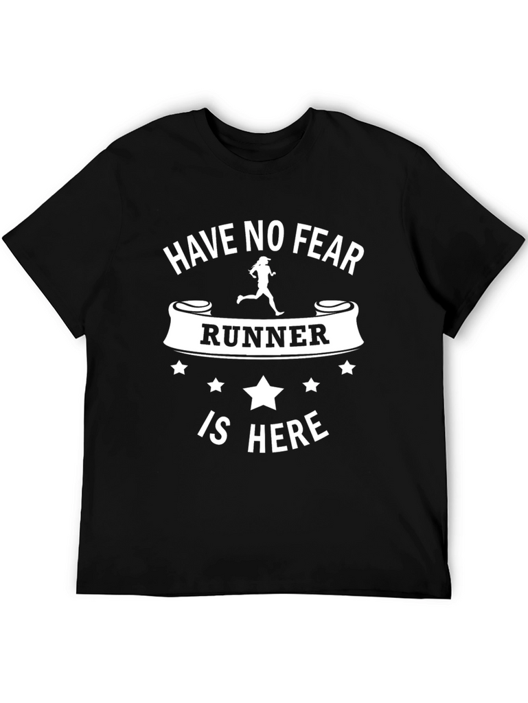 This stylish black t-shirt features a bold white graphic that celebrates the spirit of running. The design incorporates the phrase "HAVE NO FEAR RUNNER IS HERE," with an image of a runner, decorative banner and stars. Made from a comfortable, breathable fabric, this tee is perfect for everyday wear, workouts, or showing your love for running. Its classic fit makes it a great option for both men and women. Wear it to your next race, during training, or simply as a statement piece. A must-have for any running enthusiast!
