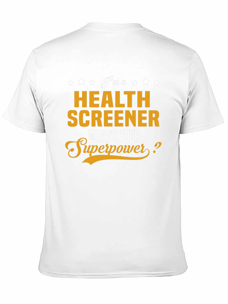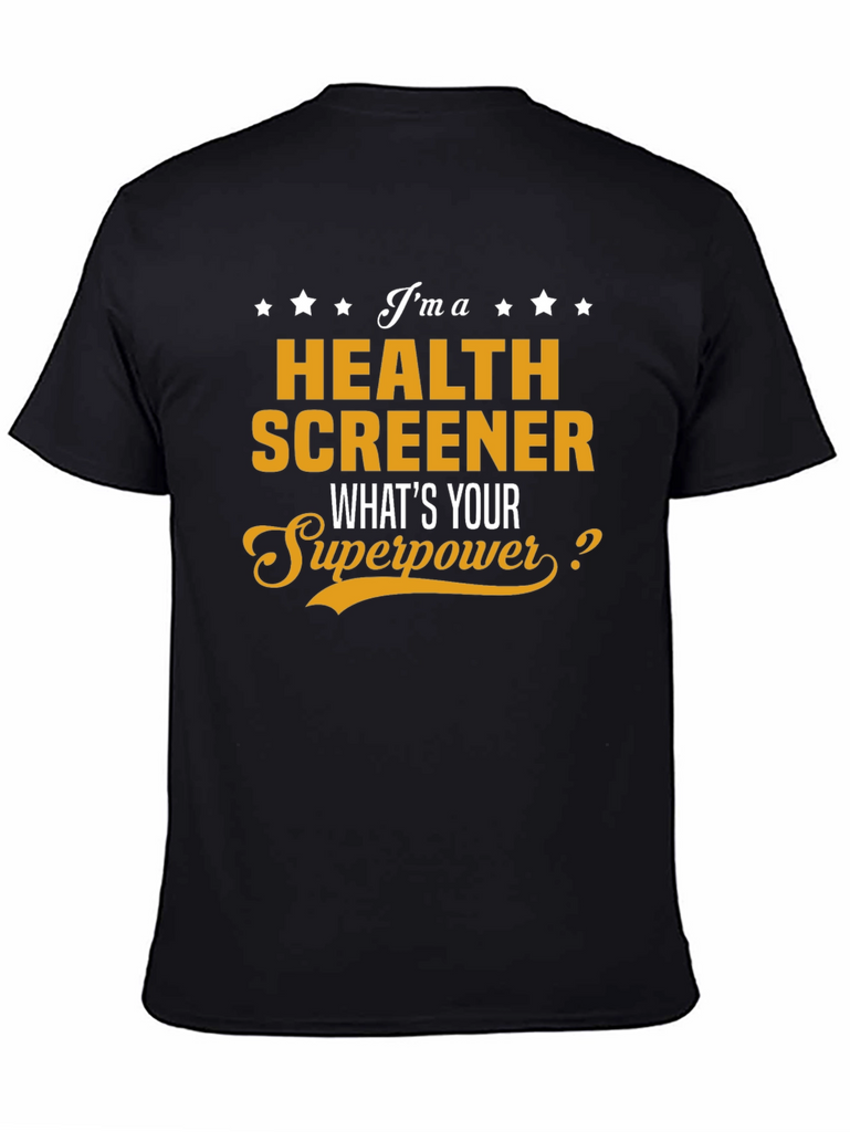 Show off your pride with this unique Health Screener T-shirt! This eye-catching tee features a bold, gold text design that reads "I'm a Health Screener, What's Your Superpower?" set against a classic black backdrop. Made from what appears to be a comfortable, breathable fabric, it's perfect for everyday wear. Ideal for health professionals, this shirt combines comfort and style, making it great for casual Fridays at work, weekend outings, or as a thoughtful gift for your favorite health screener. Let everyone know about your superpower with this fun and functional T-shirt!