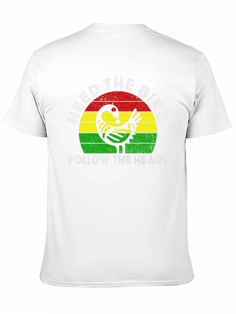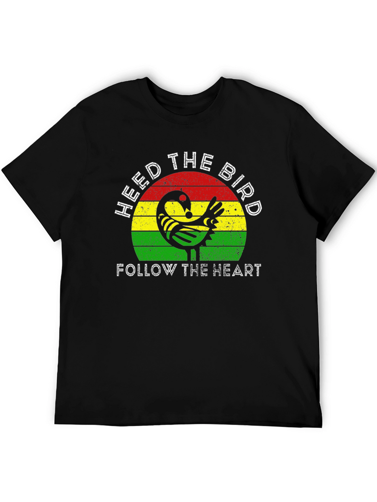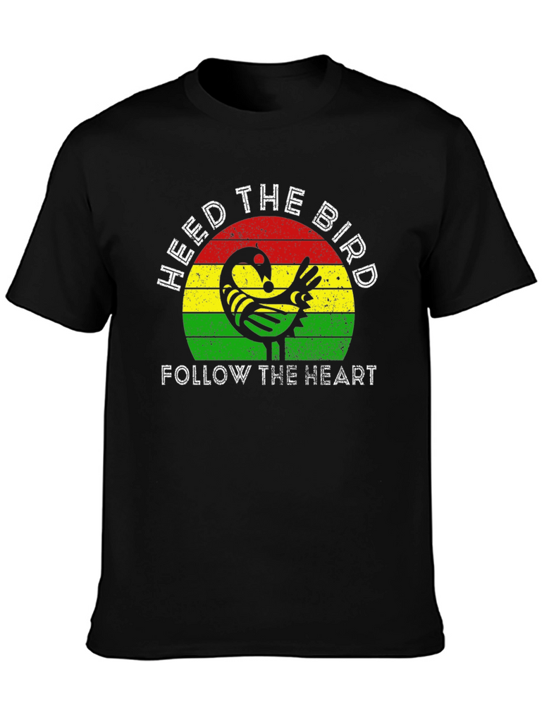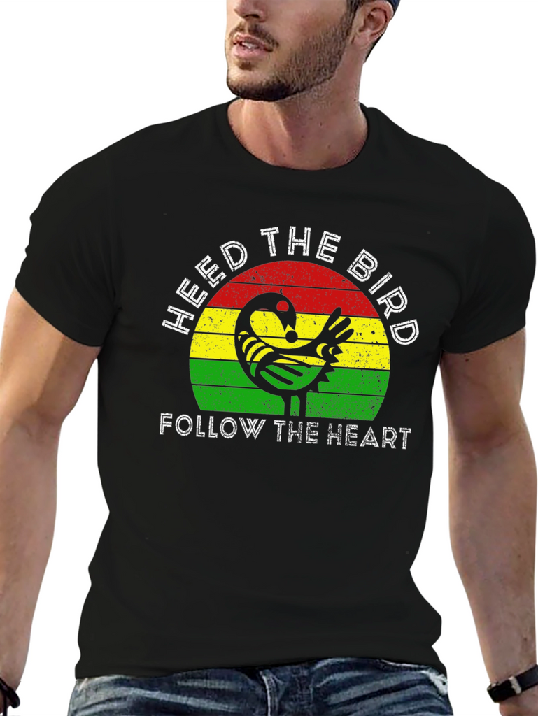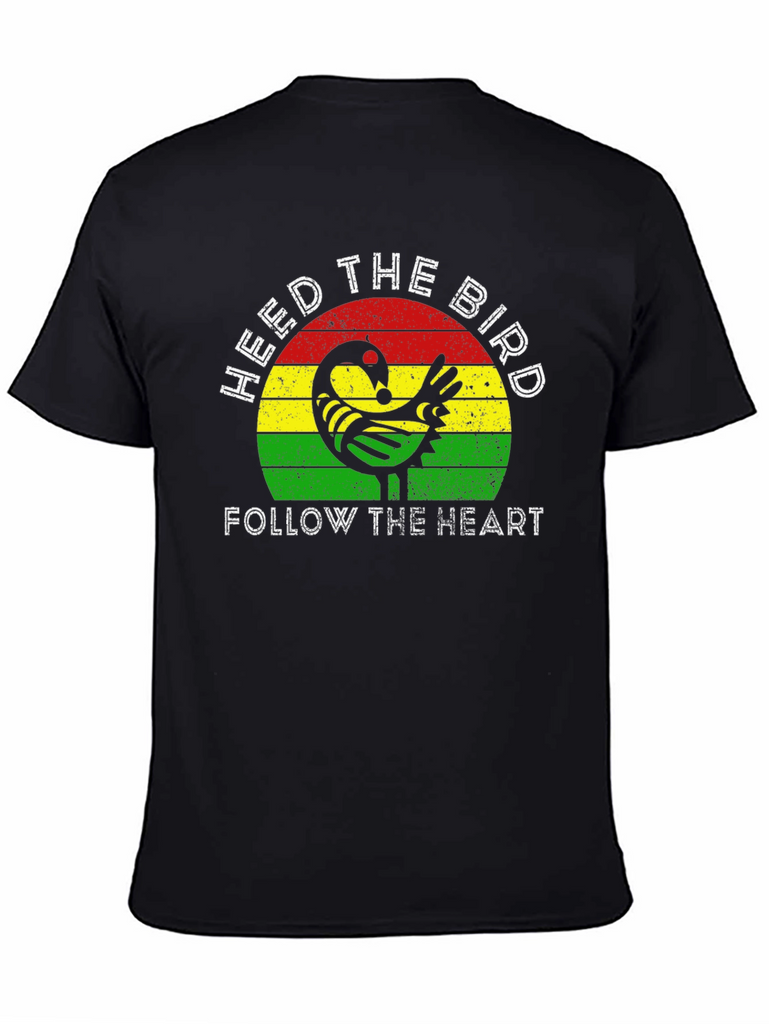 Embrace wisdom and follow your intuition with this striking graphic tee. The design features a stylized bird motif set against a vibrant backdrop of red, yellow, and green stripes. "HEED THE BIRD" and "FOLLOW THE HEART" are emblazoned in crisp white lettering. Crafted from a comfortable, soft fabric, this black t-shirt offers a classic fit suitable for everyday wear. Let this unique tee be a reminder to trust your instincts and navigate life with a mindful heart. Perfect for casual outings, expressing your individuality, or as a thoughtful gift.