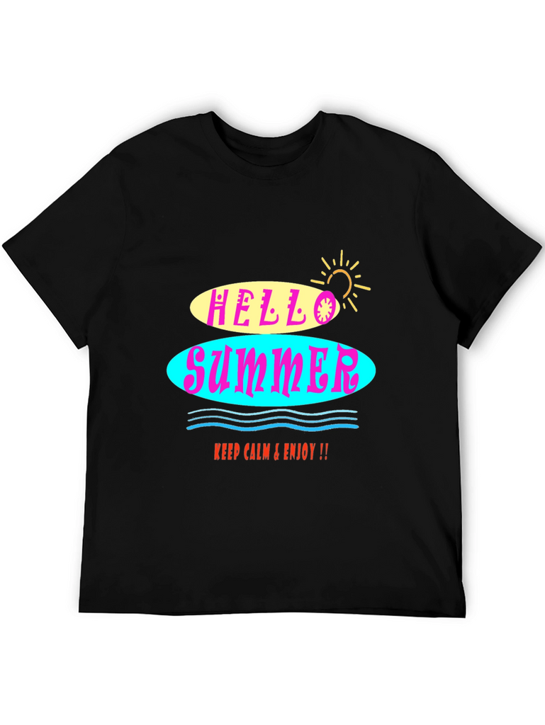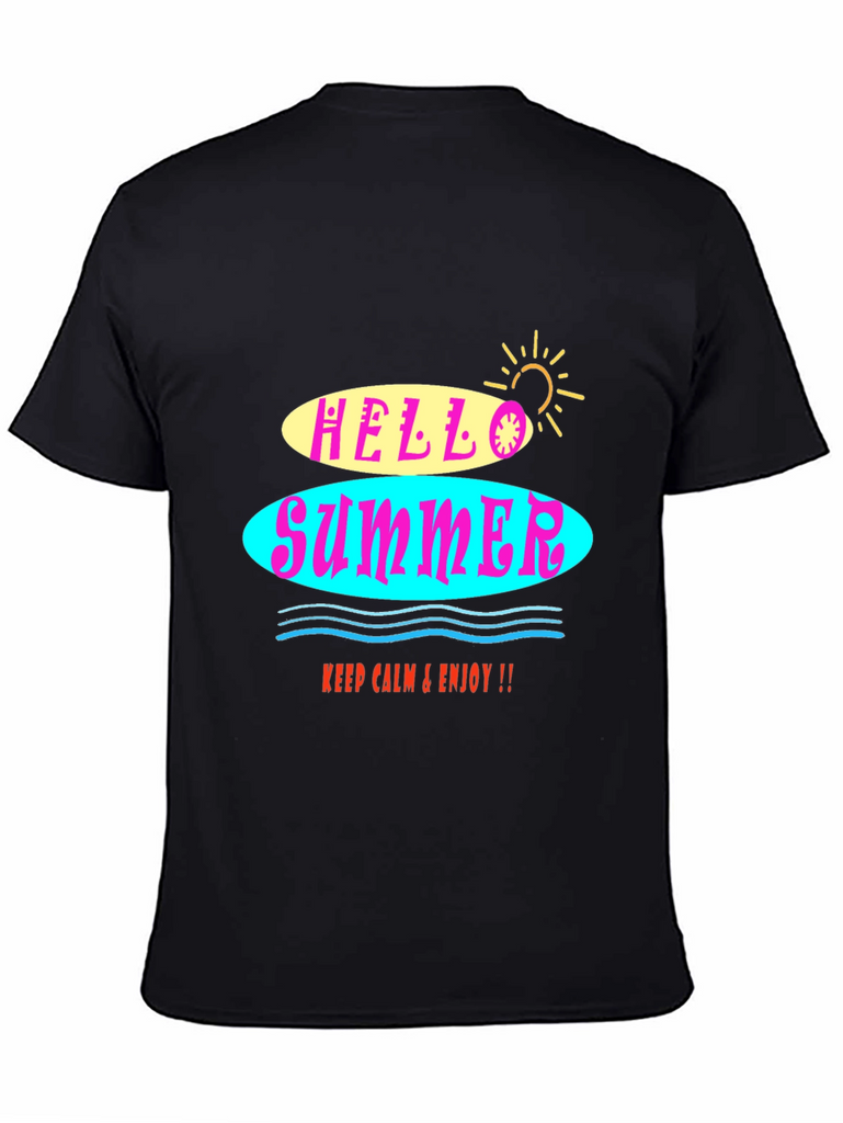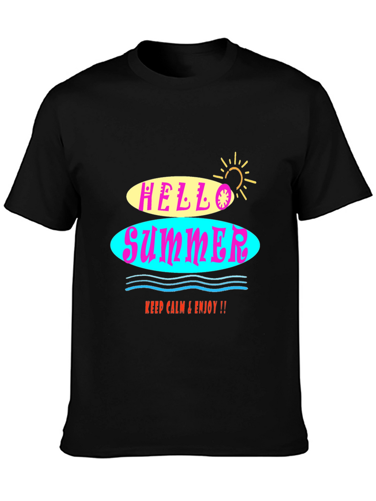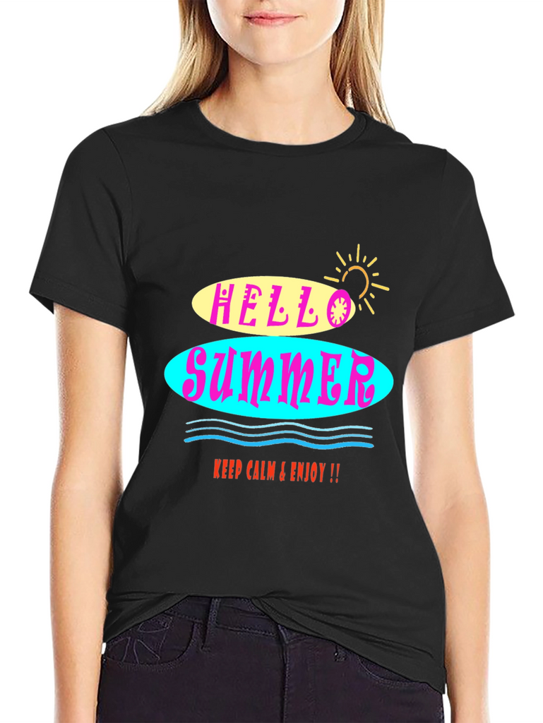 Embrace the summer vibes with this stylish black graphic tee! The shirt features a vibrant "Hello Summer" design with colorful retro-inspired lettering. The soft fabric ensures a comfortable fit, perfect for warm weather. Whether you're hitting the beach or just hanging out, this t-shirt will add a fun, laid-back touch to any outfit. It's a versatile and trendy piece that will keep you looking and feeling cool all season long. Easy to pair with jeans, shorts, or a skirt for a casual yet fashionable look.
