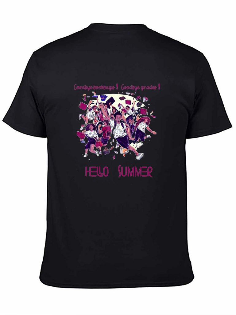 Embrace the carefree spirit of summer with this stylish black graphic tee. The shirt features a vibrant and playful design with students tossing books and celebrating freedom. Above the design, "Goodbye bookbags! Goodbye grades!" is written in pink with "HELLO SUMMER" written below. Made from comfortable fabric, this t-shirt is perfect for casual outings, beach days, or simply relaxing in the sun. Show off your excitement for summer break with this unique and eye-catching t-shirt. Its playful and expressive design is sure to make a statement wherever you go. Get yours today and welcome the summer vibes!
