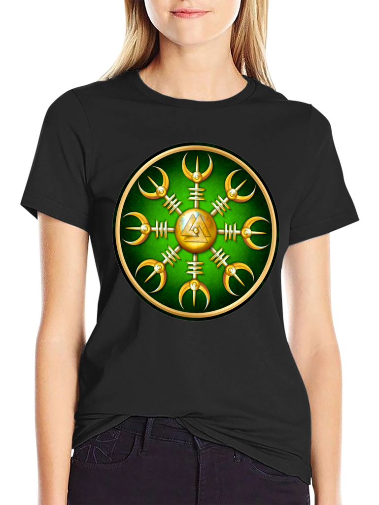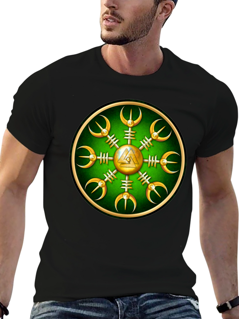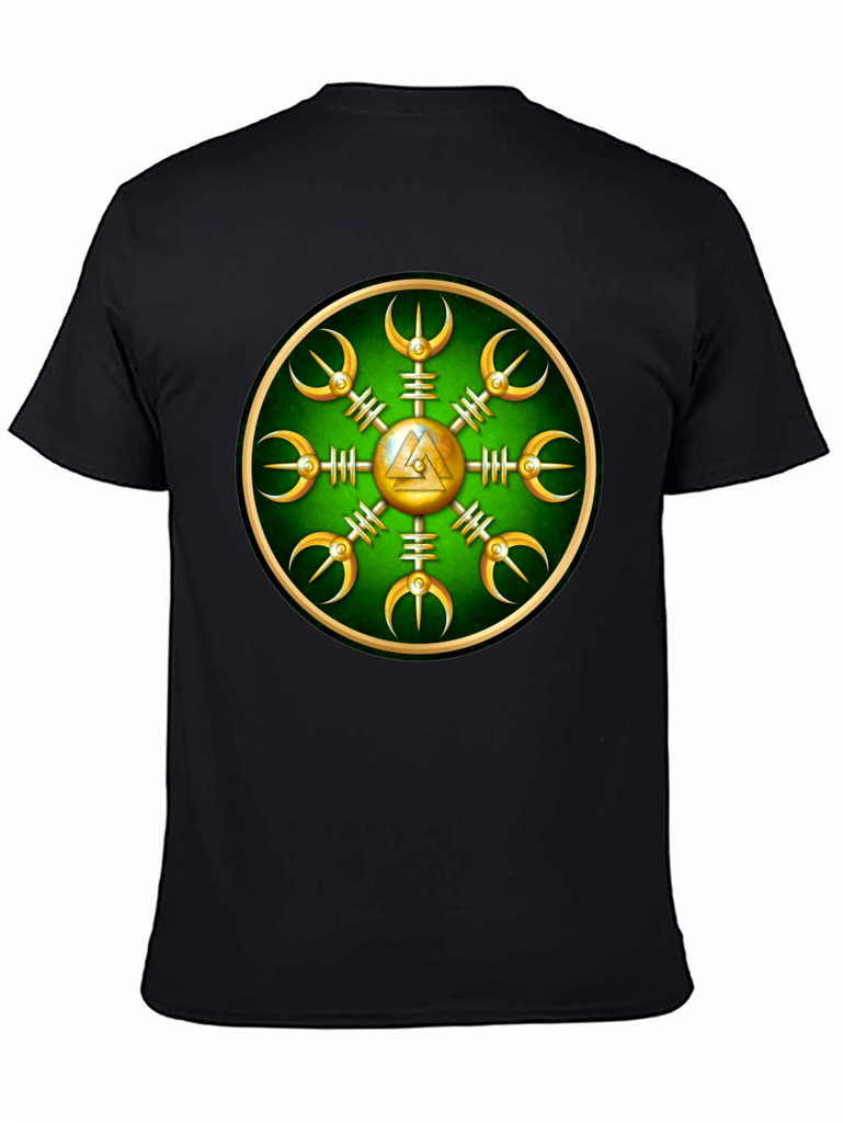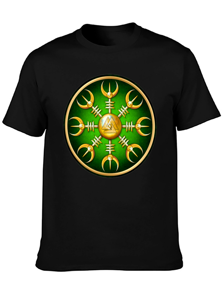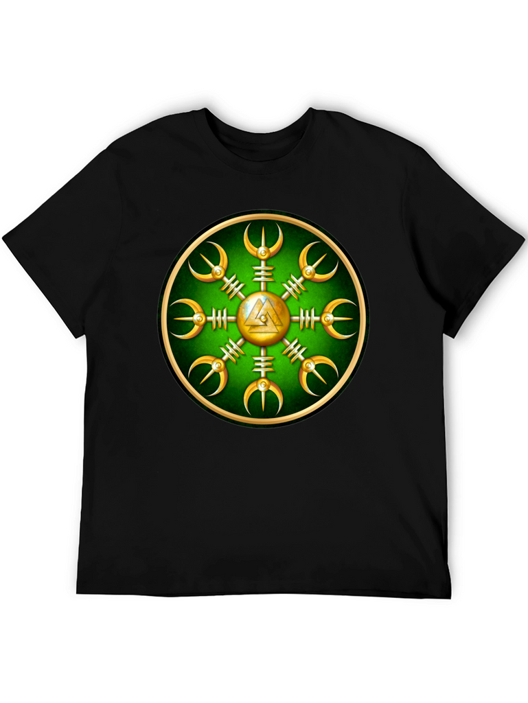 Embrace Norse mythology with this striking black t-shirt. The design features a large, vibrant Helm of Awe symbol. A gold-colored central emblem surrounded by a green and gold circle creates a captivating focal point. Crafted from comfortable material, this tee is perfect for everyday wear, themed events, or showcasing your appreciation for Viking culture. Stand out with this unique and eye-catching design, a must-have for history enthusiasts and fashion-forward individuals alike. The intricate details and bold colors ensure a powerful statement piece.