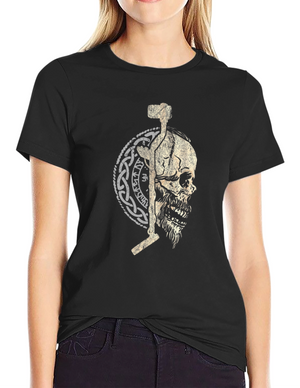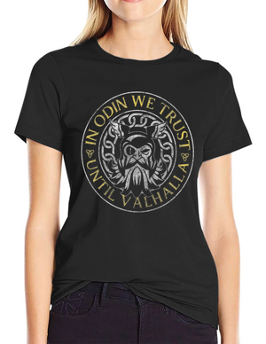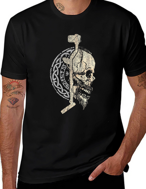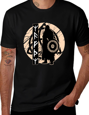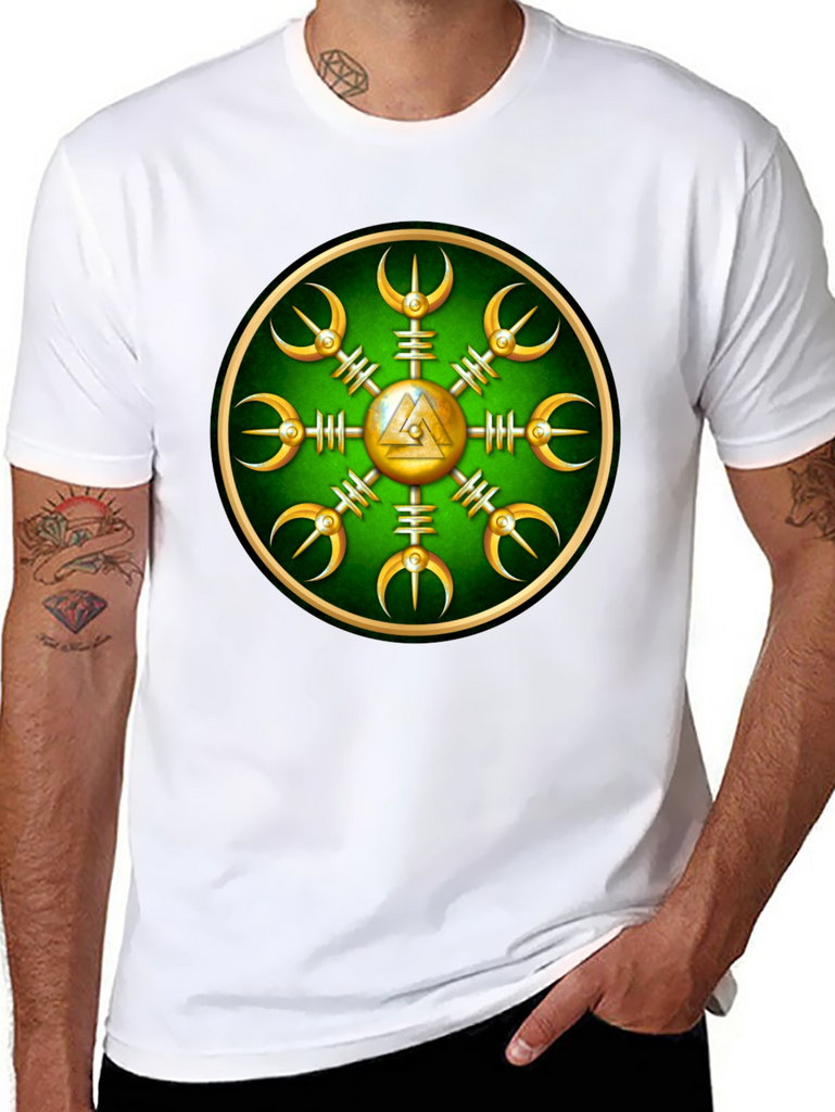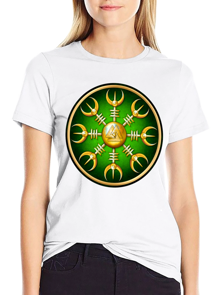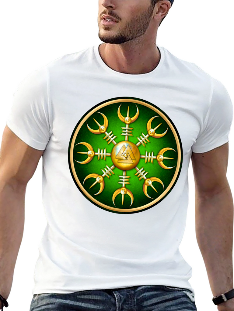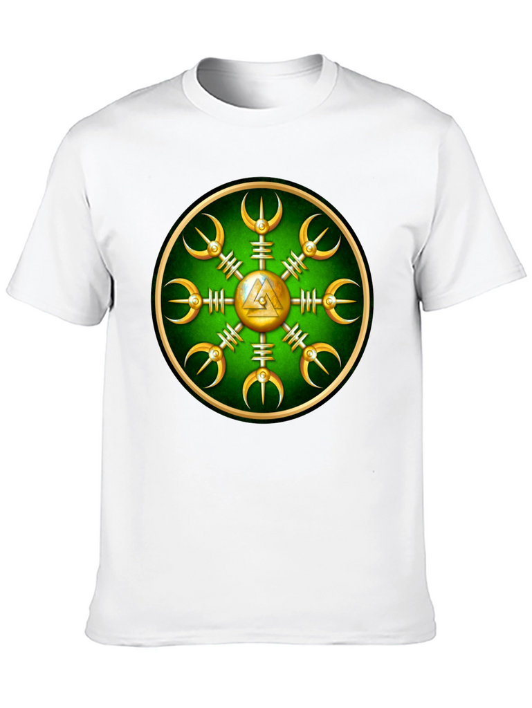 Embrace Norse mythology with this striking black t-shirt. The design features a large, vibrant Helm of Awe symbol. A gold-colored central emblem surrounded by a green and gold circle creates a captivating focal point. Crafted from comfortable material, this tee is perfect for everyday wear, themed events, or showcasing your appreciation for Viking culture. Stand out with this unique and eye-catching design, a must-have for history enthusiasts and fashion-forward individuals alike. The intricate details and bold colors ensure a powerful statement piece.