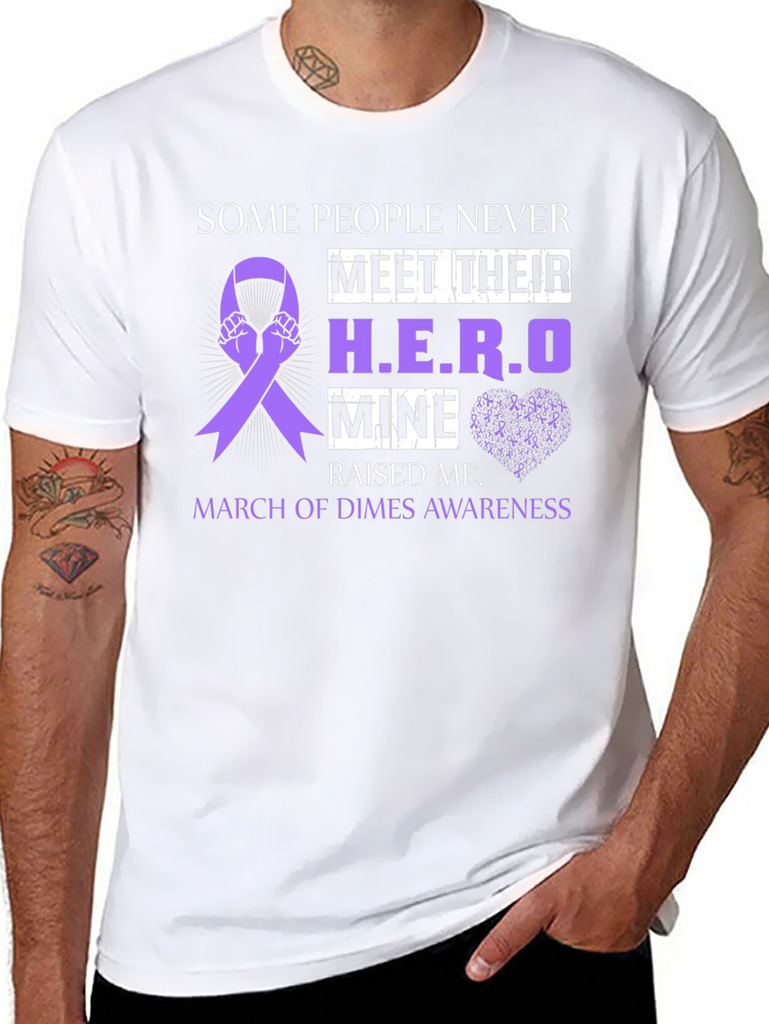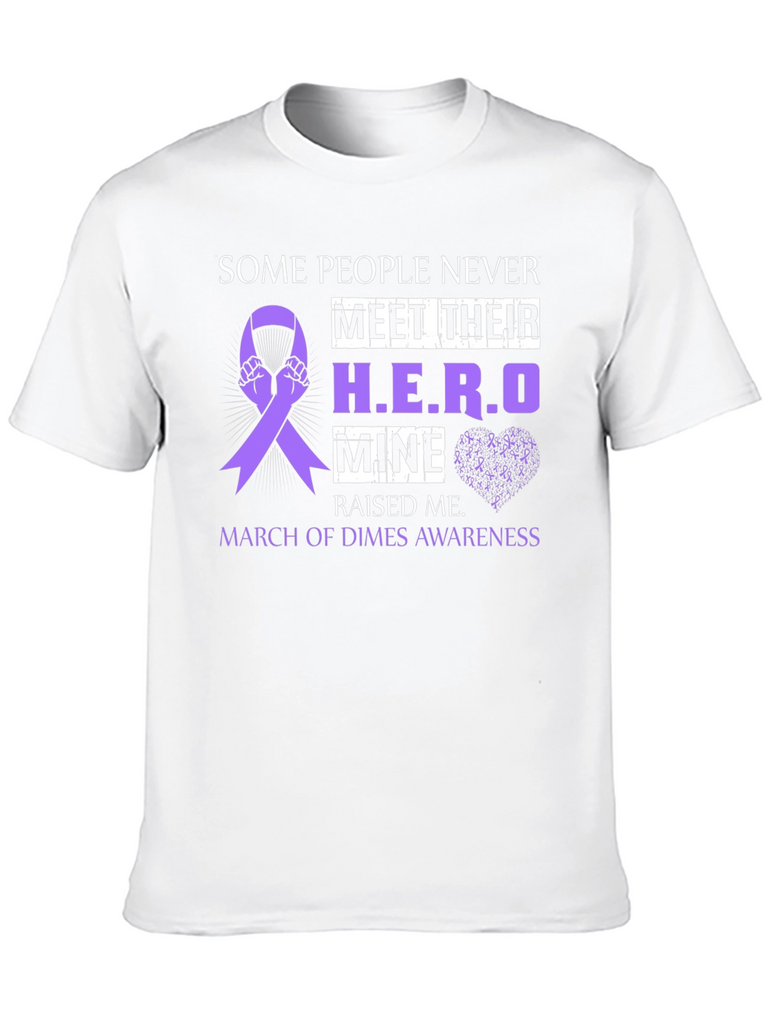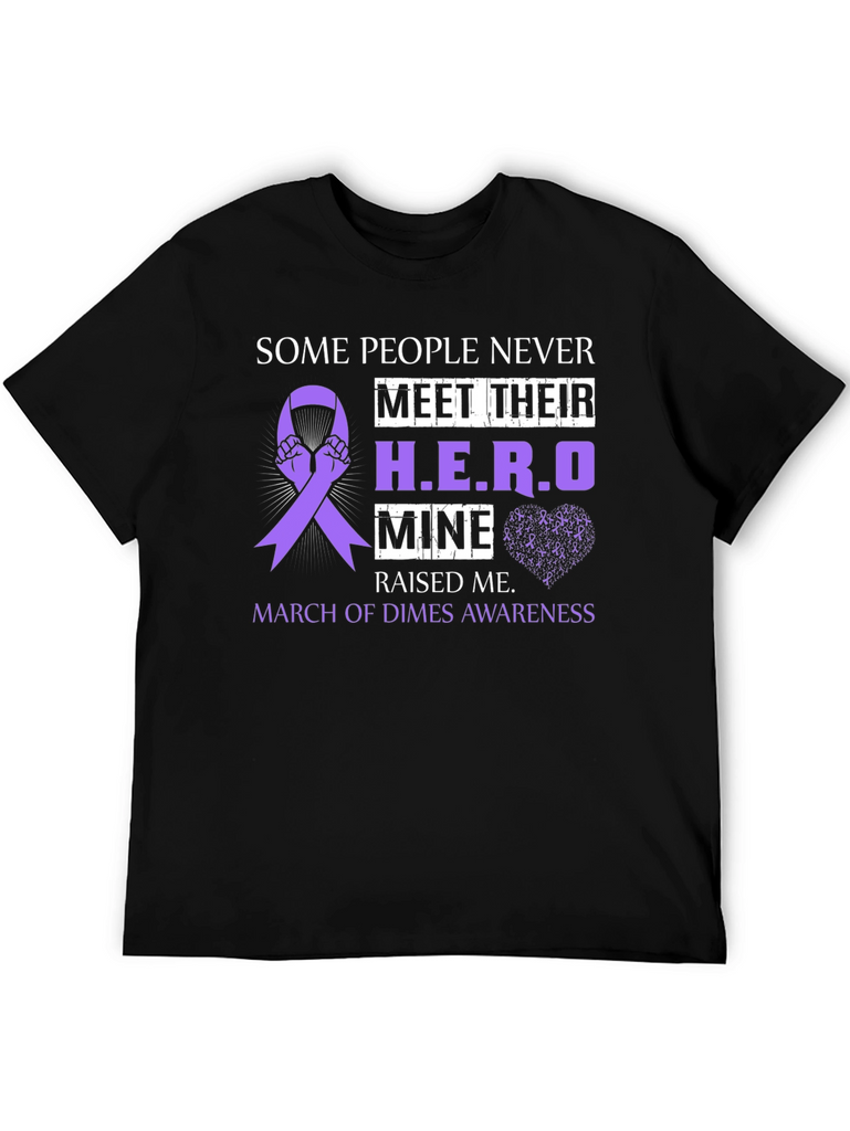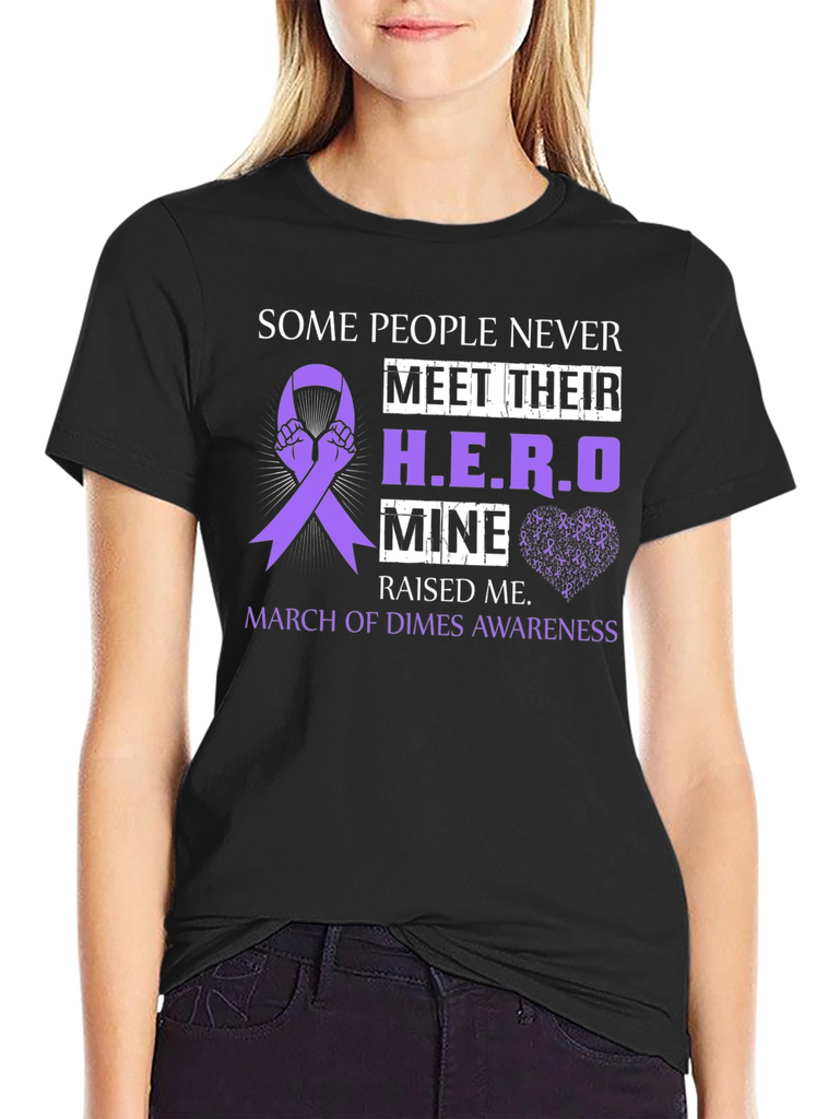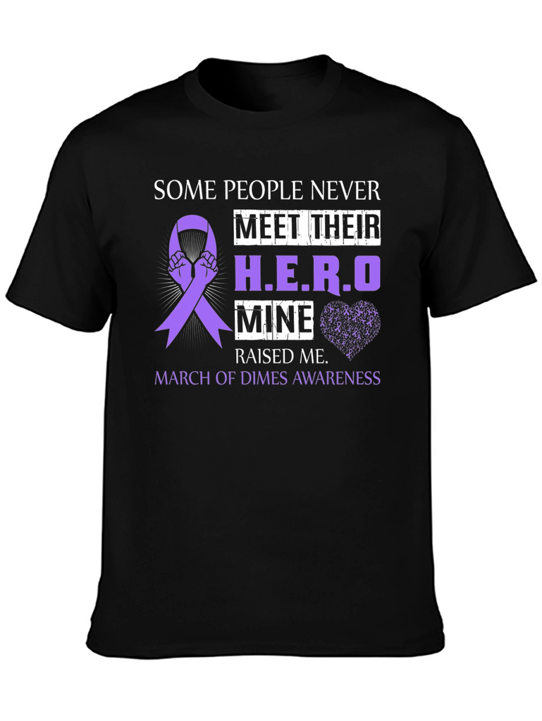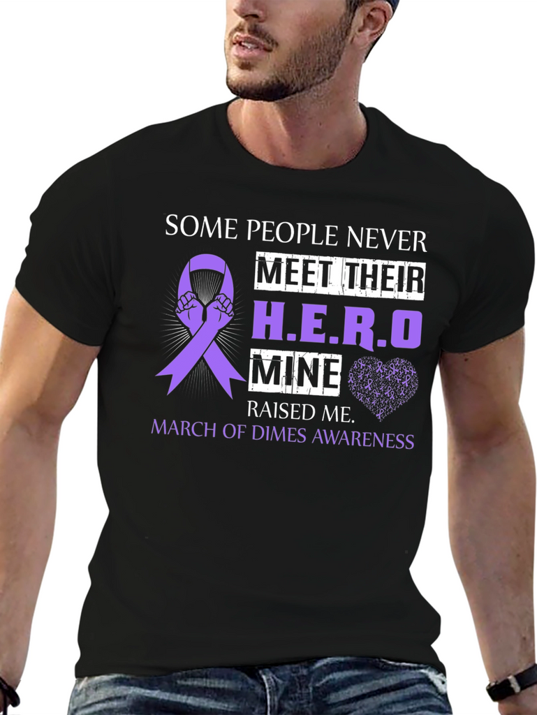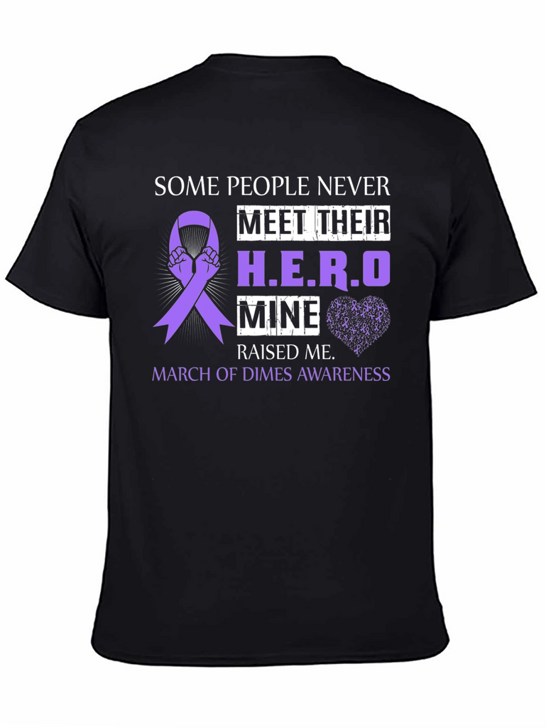 Show your support with this black t-shirt featuring a purple awareness ribbon design. The shirt reads 'Some People Never Meet Their H.E.R.O, Mine Raised Me,' and 'March of Dimes Awareness.' The design incorporates hands holding the awareness ribbon and a subtle heart made of tiny awareness ribbons. Perfect for raising awareness or showing appreciation for a hero in your life, this comfortable and stylish t-shirt is an ideal way to make a statement. Makes a thoughtful gift.