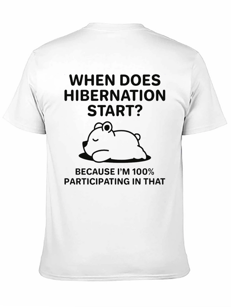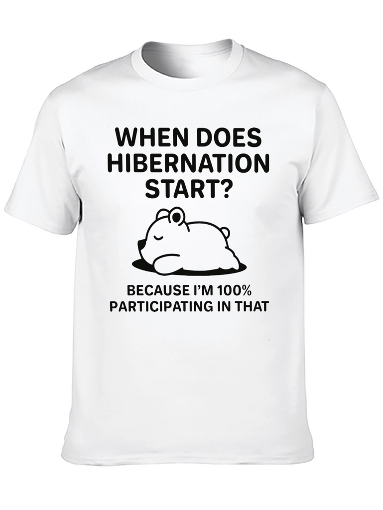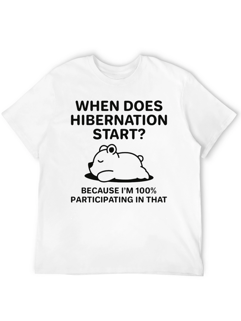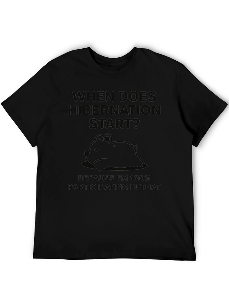 This relaxed-fit black t-shirt features a playful design. A humorous phrase about hibernation appears above a graphic of a sleeping bear. It's made from a soft-looking, breathable fabric, ideal for casual wear. This tee is perfect for anyone who appreciates a good nap and witty sayings. Wear it while lounging at home, running errands, or meeting friends for a casual hangout. Express your love for all things cozy with this fun and comfortable tee!